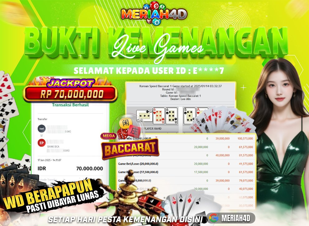 Selamat Kepada ID : E******7 Atas Withdraw Rp. 70.000.000 Juta Hari ini. Ditunggu Withdraw Selanjutnya dan ajak juga teman temannya bergabung di Meriah4d