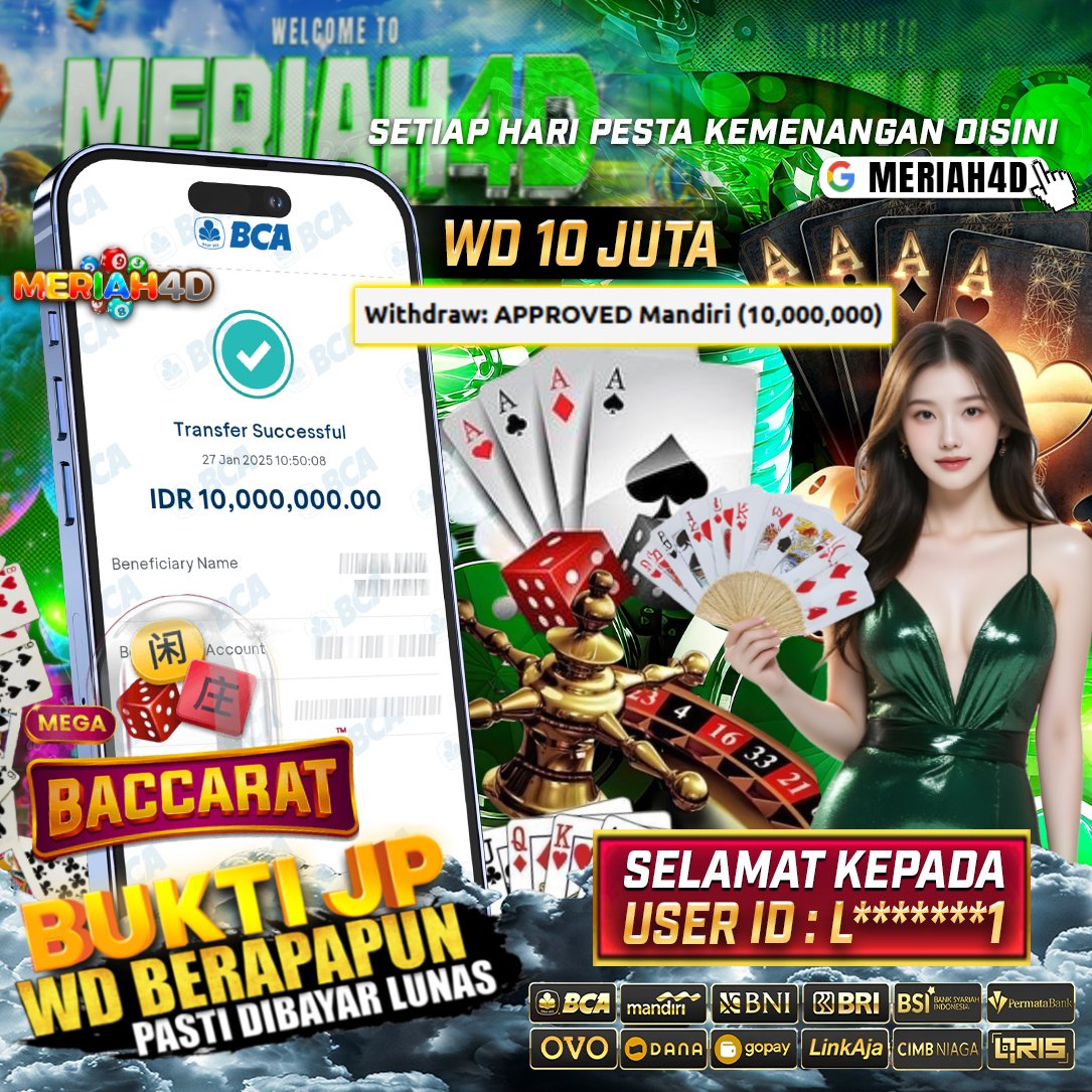 Selamat Kepada ID : L******1 Atas Withdraw Rp. 10.000.000 Juta Hari ini. Ditunggu Withdraw Selanjutnya dan ajak juga teman temannya bergabung di Meriah4d