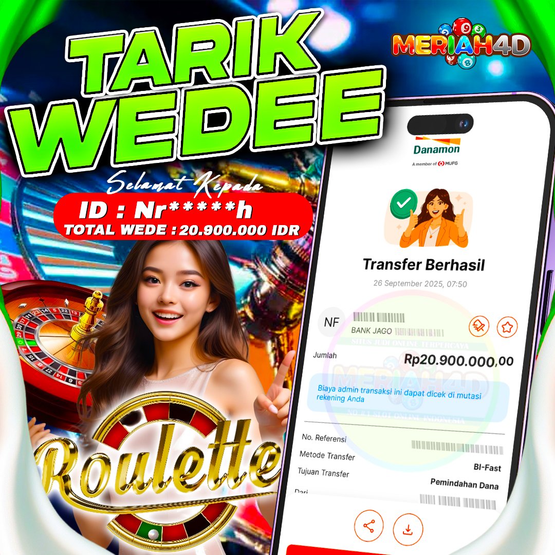Selamat Kepada ID : Nr*****h Atas Withdraw Rp. 20.900.000 Juta Hari ini. Ditunggu Withdraw Selanjutnya dan ajak juga teman temannya bergabung di Meriah4d
