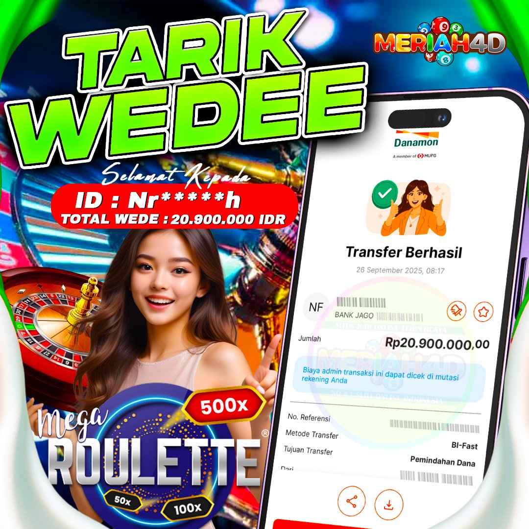 Selamat Kepada ID : Nr*****h Atas Withdraw Rp. 20.900.000 Juta Hari ini. Ditunggu Withdraw Selanjutnya dan ajak juga teman temannya bergabung di Meriah4d