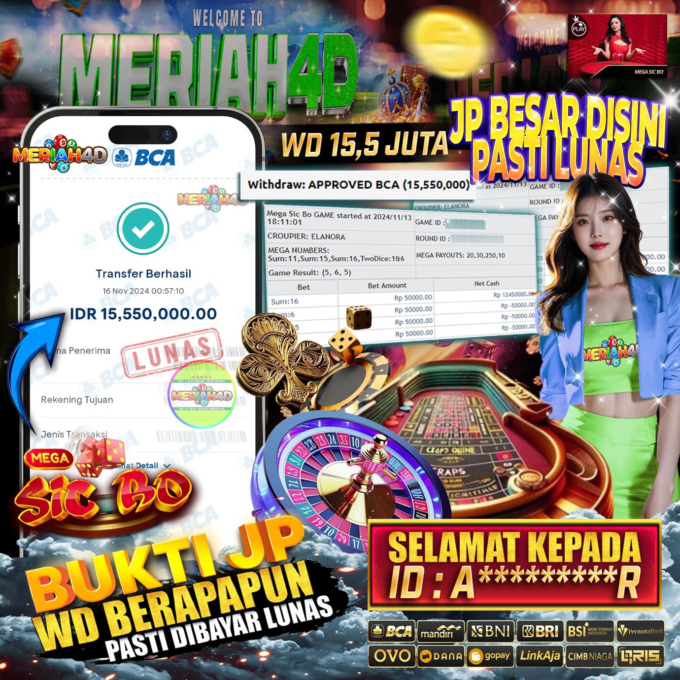 Selamat Kepada Id : A********R Atas Withdraw Rp. 15.500.000 Juta Hari ini. Ditunggu Withdraw Selanjutnya dan ajak juga teman temannya bergabung di Meriah4d