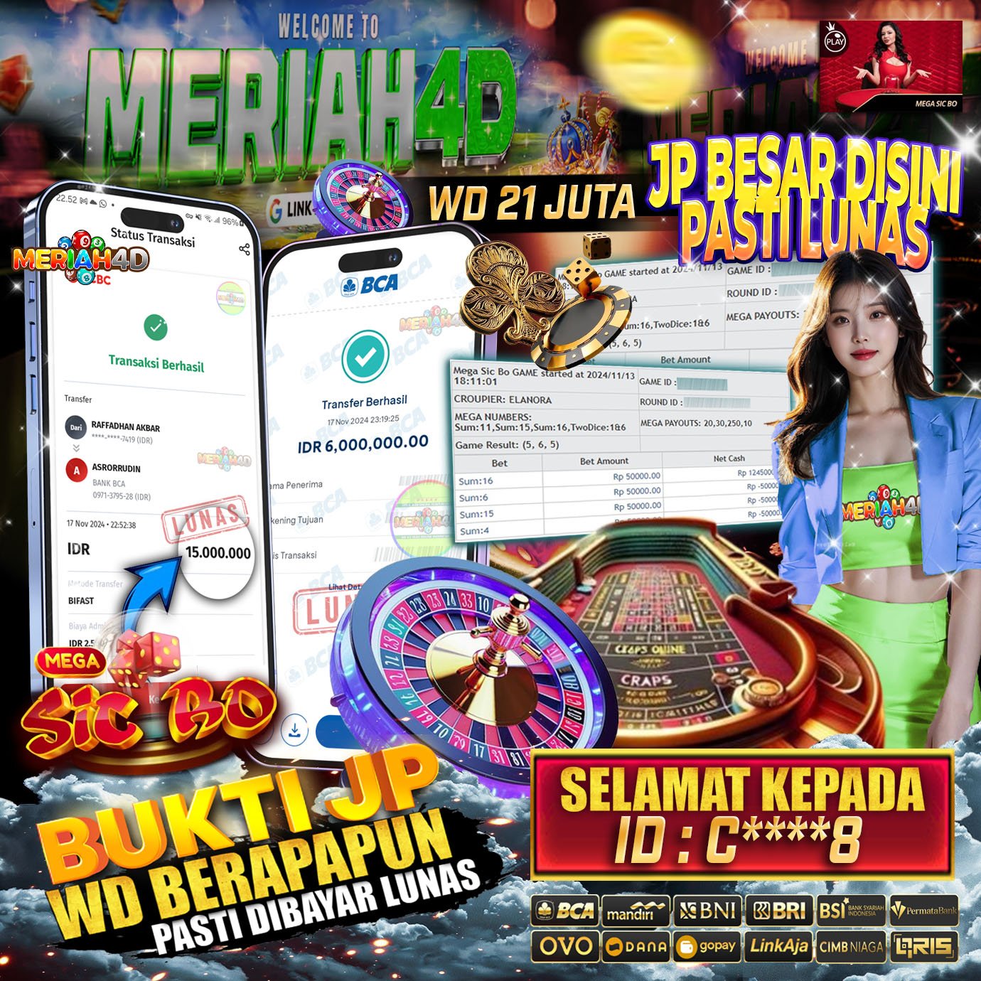 Selamat Kepada Id : C******8 Atas Withdraw Rp. 21.000.000 Juta Hari ini. Ditunggu Withdraw Selanjutnya dan ajak juga teman temannya bergabung di Meriah4d