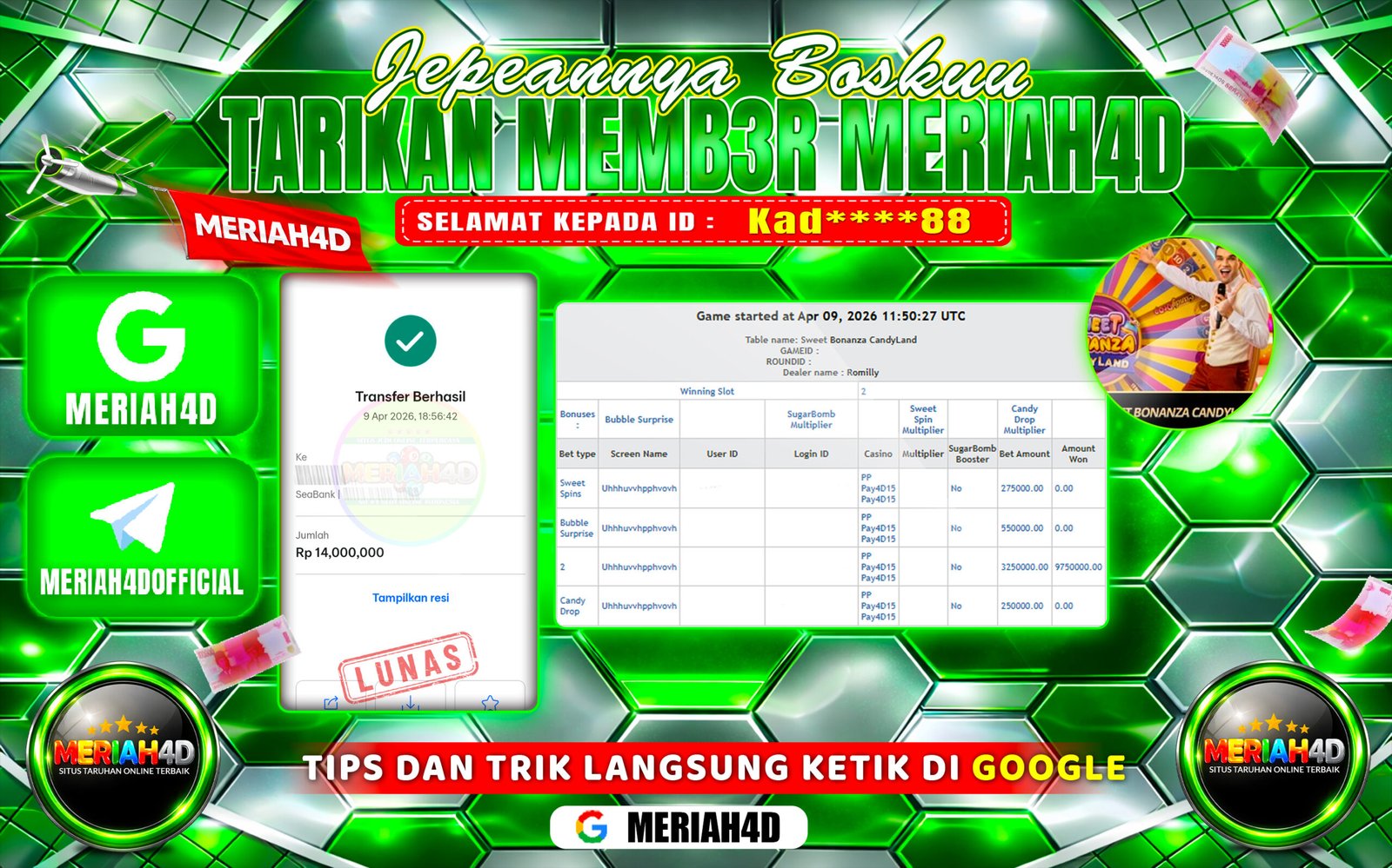 Selamat Kepada ID : Kad*****88 Atas Withdraw Rp. 14.000.000 Juta Hari ini. Ditunggu Withdraw Selanjutnya dan ajak juga teman temannya bergabung di Meriah4d