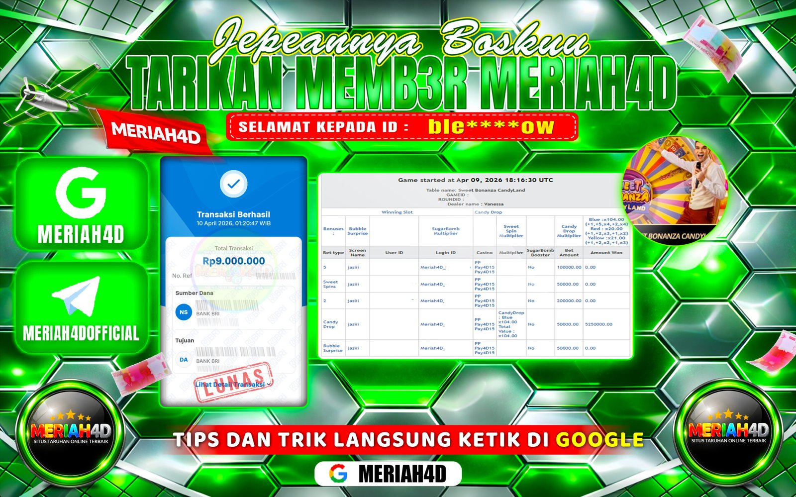 Selamat Kepada ID : ble*****ow Atas Withdraw Rp. 9.000.000 Juta Hari ini. Ditunggu Withdraw Selanjutnya dan ajak juga teman temannya bergabung di Meriah4d