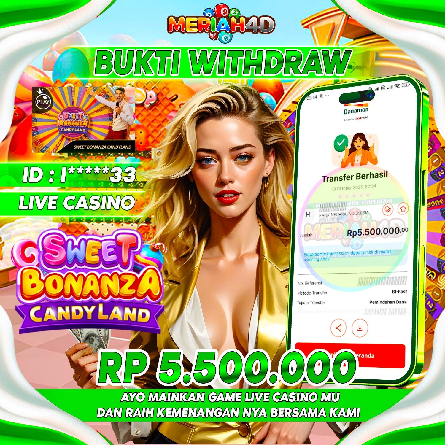 Selamat Kepada ID : I*****33 Atas Withdraw Rp. 5.500.000 Juta Hari ini. Ditunggu Withdraw Selanjutnya dan ajak juga teman temannya bergabung di Meriah4d