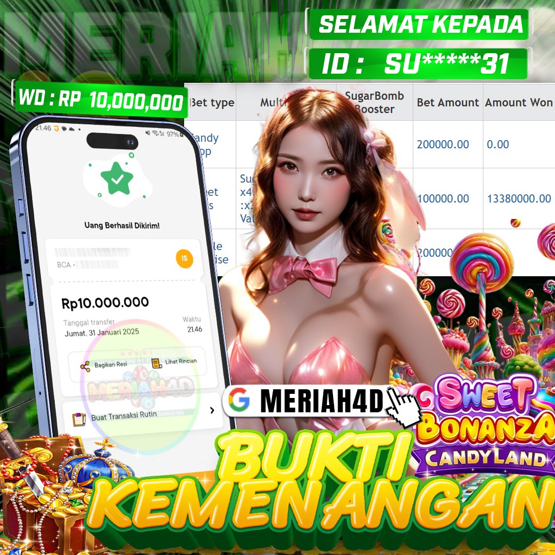 Selamat Kepada ID : SU******31 Atas Withdraw Rp. 10.000.000 Juta Hari ini. Ditunggu Withdraw Selanjutnya dan ajak juga teman temannya bergabung di Meriah4d