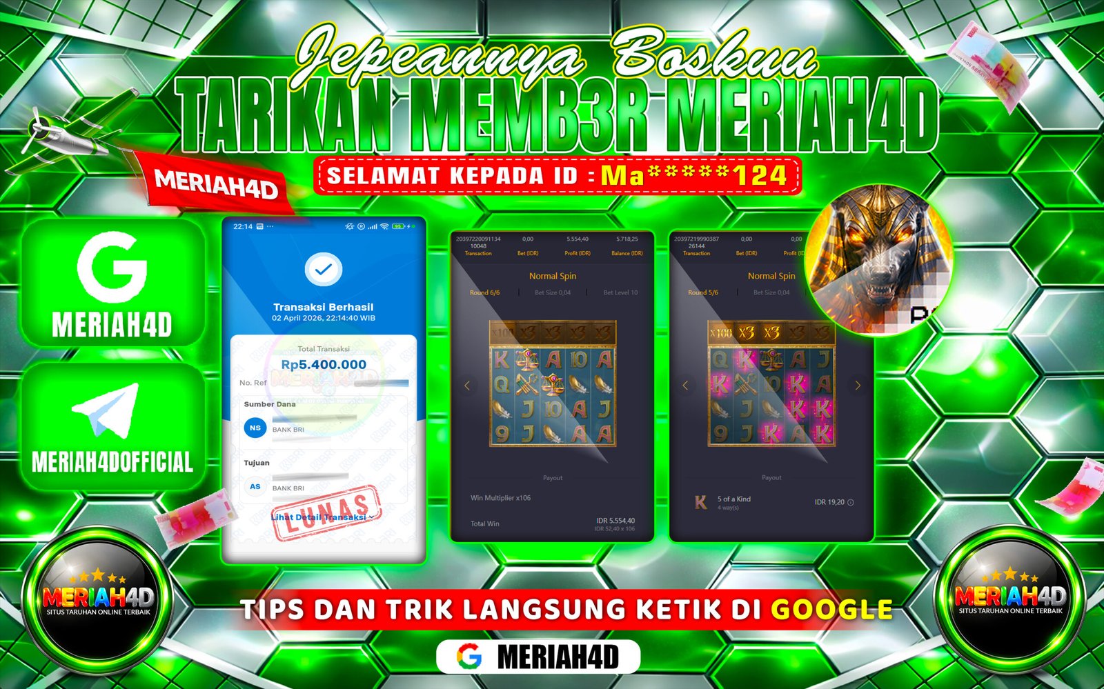Selamat Kepada ID : MA****124 Atas Withdraw Rp.5.400.000 Juta Hari ini. Ditunggu Withdraw Selanjutnya dan ajak juga teman temannya bergabung di Meriah4d