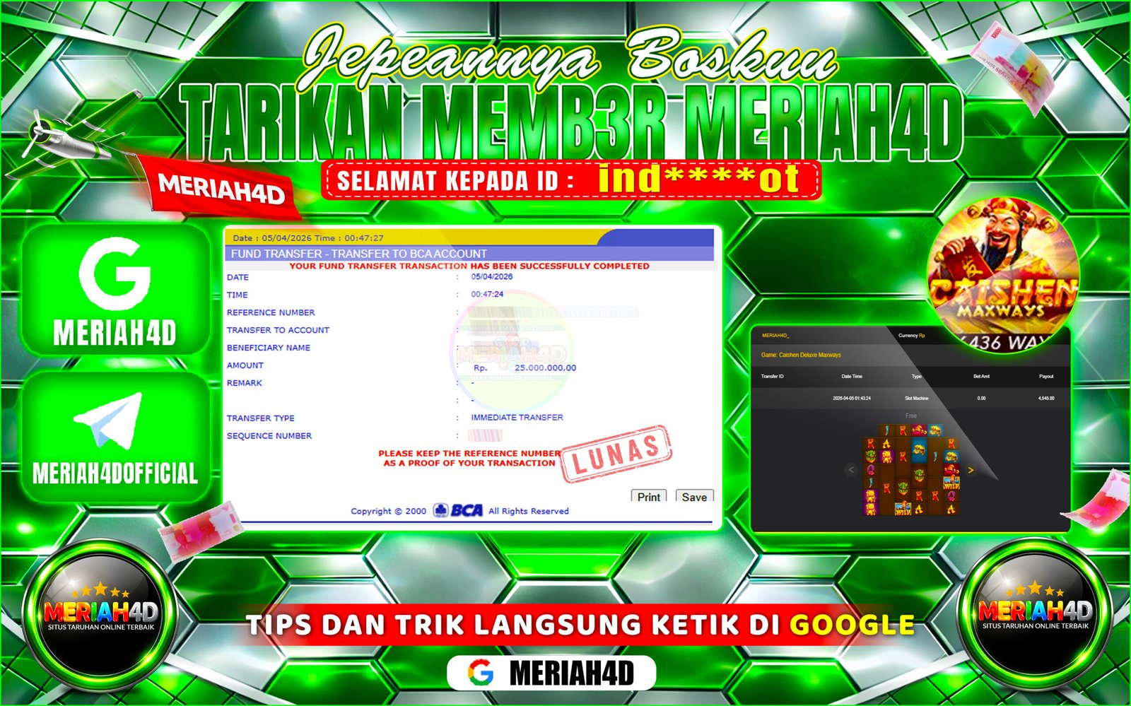Selamat Kepada ID : Ind*******ot Atas Withdraw Rp. 25.000.000 Juta Hari ini. Ditunggu Withdraw Selanjutnya dan ajak juga teman temannya bergabung di Meriah4d