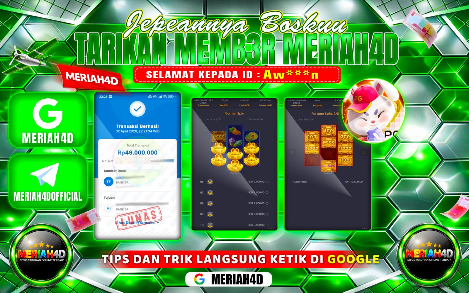 Selamat Kepada ID : AW****N Atas Withdraw Rp. 49.000.000 Juta Hari ini. Ditunggu Withdraw Selanjutnya dan ajak juga teman temannya bergabung di Meriah4d