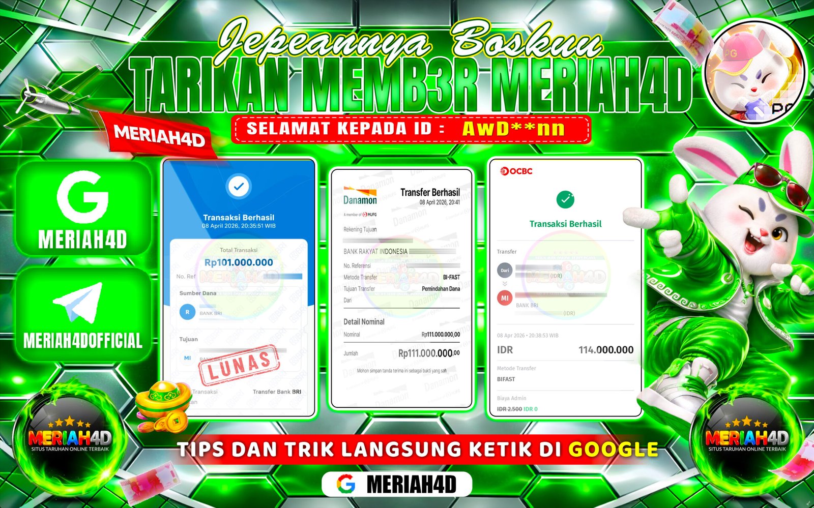 Selamat Kepada ID : AwD****nn Atas Withdraw Rp. 326.000.000 Juta Hari ini. Ditunggu Withdraw Selanjutnya dan ajak juga teman temannya bergabung di Meriah4d
