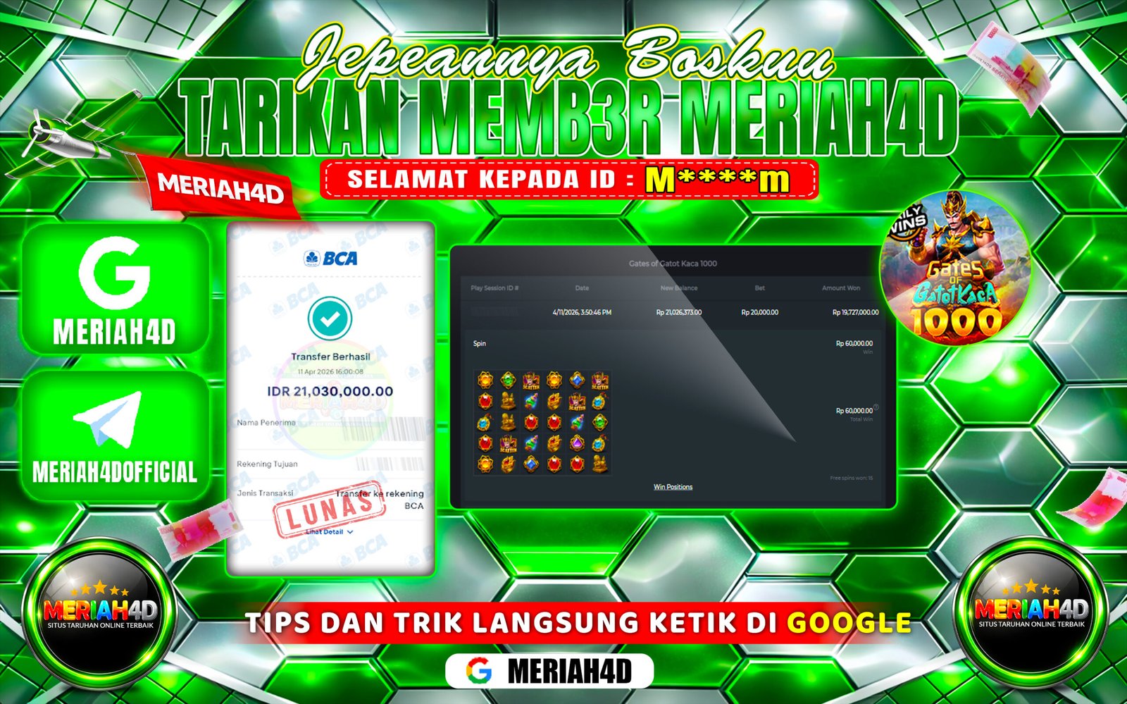 Selamat Kepada ID : M****m Atas Withdraw Rp. 21.030.000 Juta Hari ini. Ditunggu Withdraw Selanjutnya dan ajak juga teman temannya bergabung di Meriah4d
