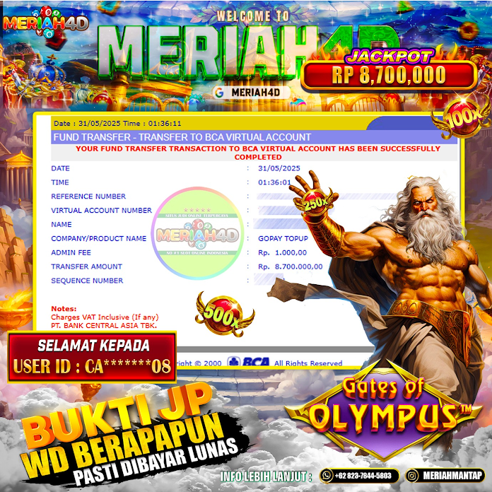 Selamat Kepada ID : GA*****08 Atas Withdraw Rp. 8,700,000 Juta Hari ini. Ditunggu Withdraw Selanjutnya dan ajak juga teman temannya bergabung di Meriah4d