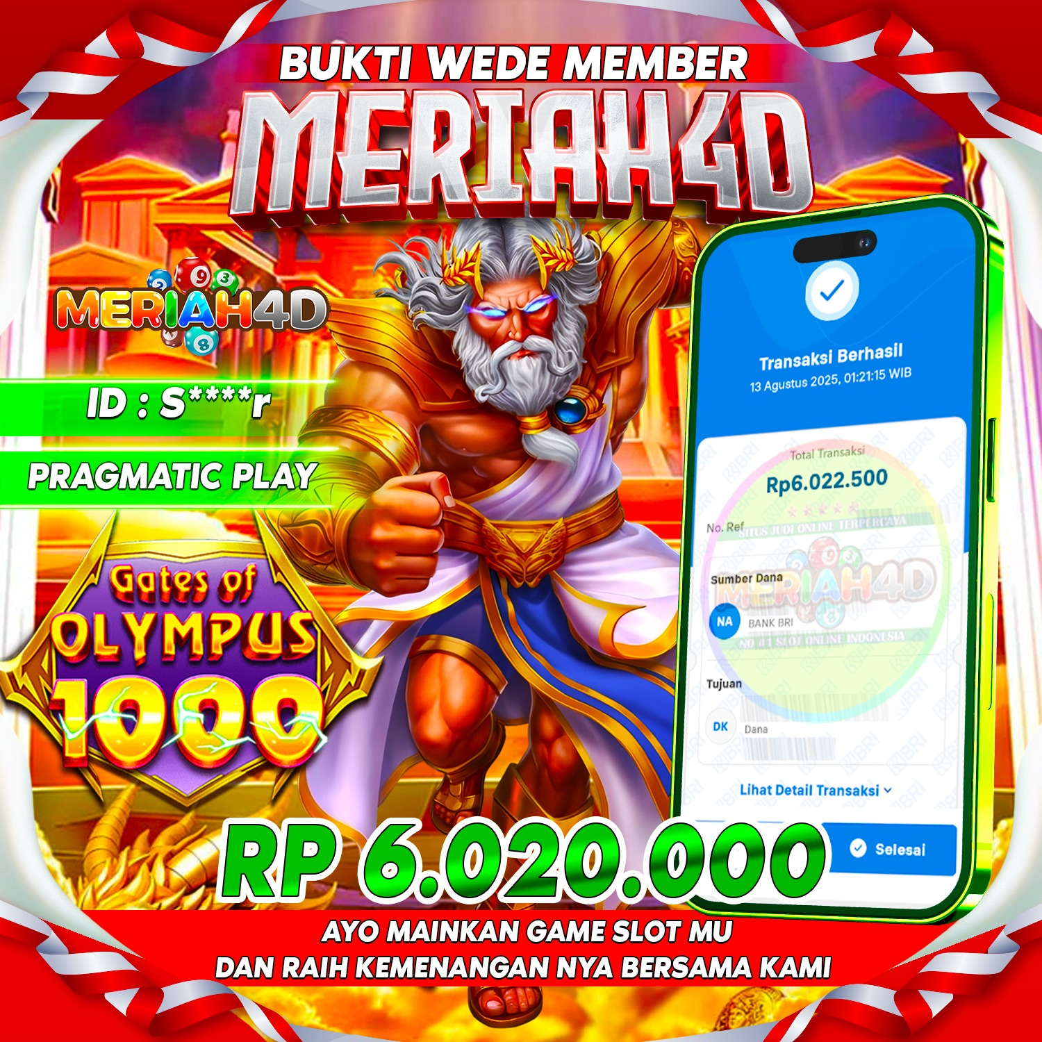 Selamat Kepada ID : S******R Atas Withdraw Rp. 6.020.000 Juta Hari ini. Ditunggu Withdraw Selanjutnya dan ajak juga teman temannya bergabung di Meriah4d
