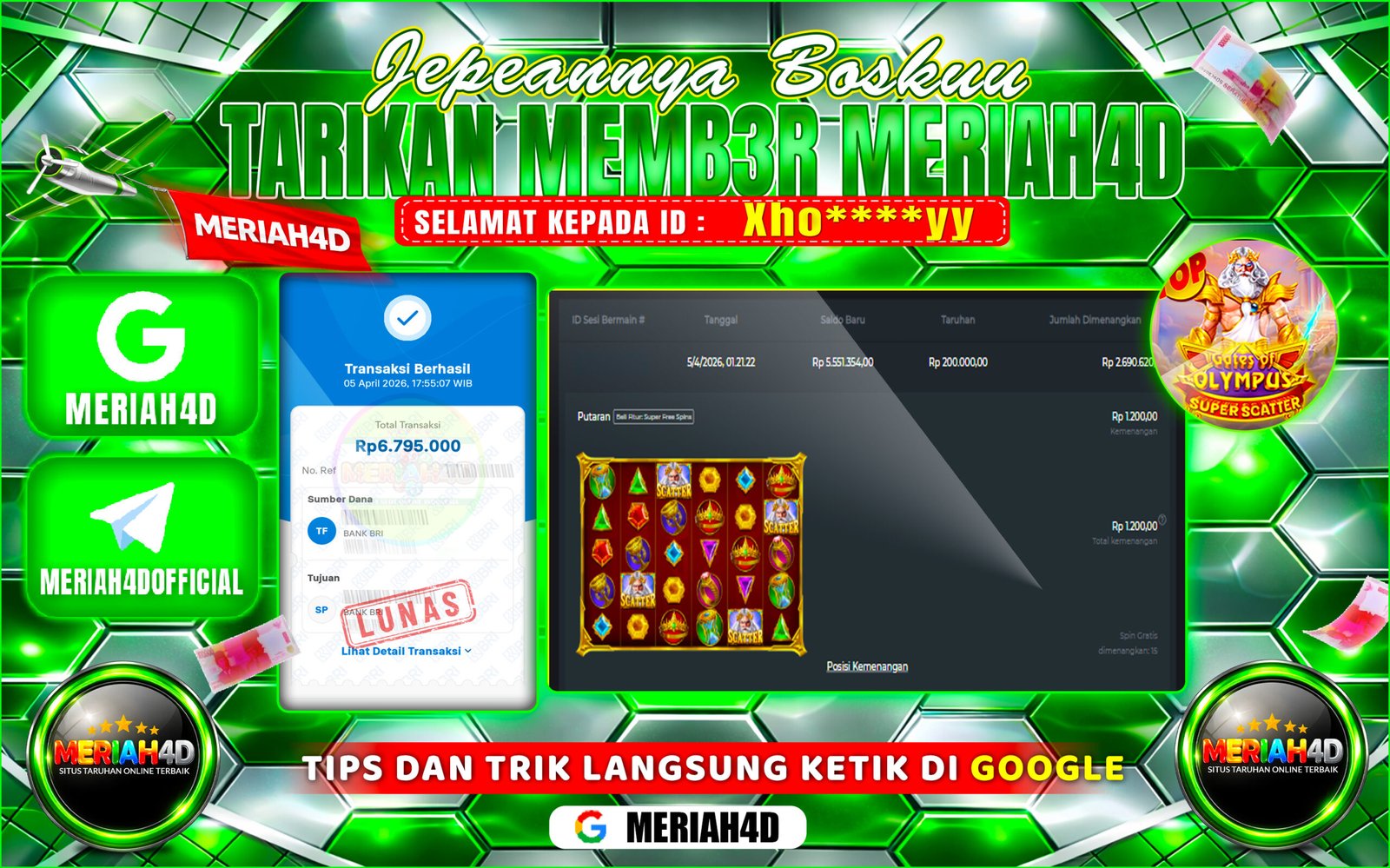 Selamat Kepada ID : Xho****yy Atas Withdraw Rp. 6.795.000 Juta Hari ini. Ditunggu Withdraw Selanjutnya dan ajak juga teman temannya bergabung di Meriah4d