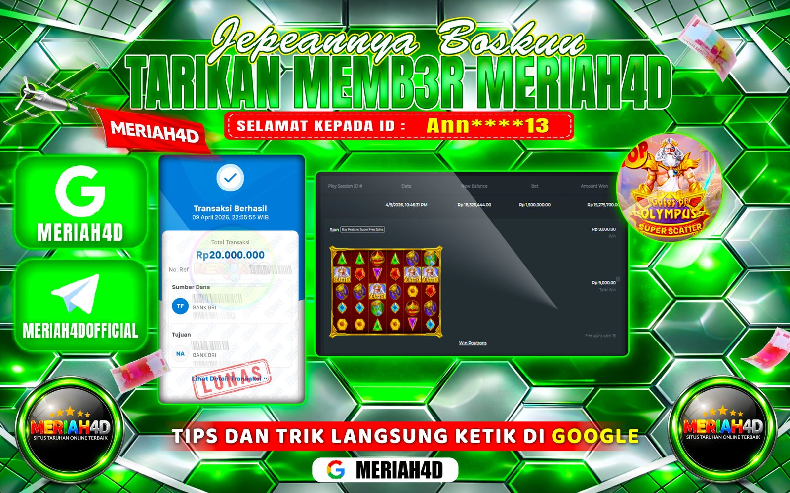 Selamat Kepada ID : Ann****13 Atas Withdraw Rp. 20.000.000 Juta Hari ini. Ditunggu Withdraw Selanjutnya dan ajak juga teman temannya bergabung di Meriah4d