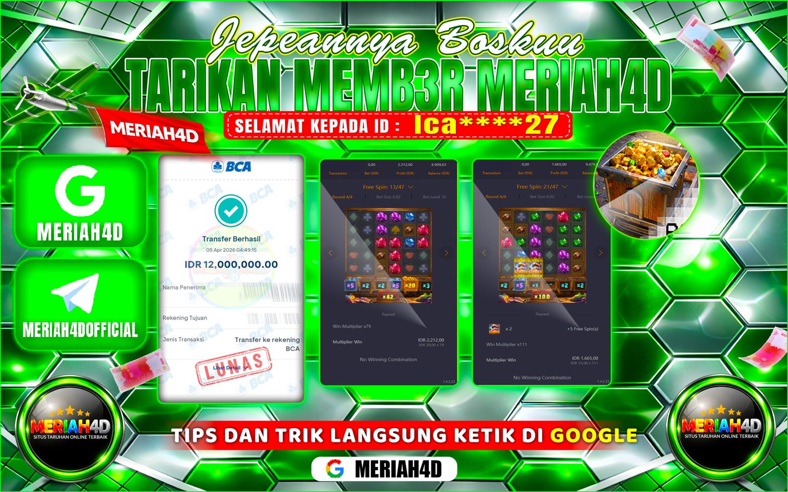 Selamat Kepada Id : Ica*****27 Atas Withdraw Rp. 12.000.000 Juta Hari ini. Ditunggu Withdraw Selanjutnya dan ajak juga teman temannya bergabung di Meriah4d