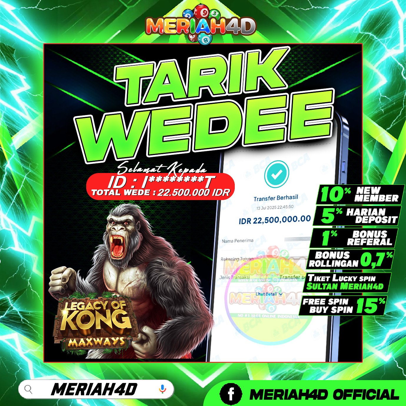 Selamat Kepada ID : I******T Atas Withdraw Rp. 22.500.000 Juta Hari ini. Ditunggu Withdraw Selanjutnya dan ajak juga teman temannya bergabung di Meriah4d