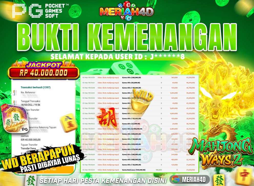 Selamat Kepada ID : J*****8 Atas Withdraw Rp. 40.000.000 Juta Hari ini. Ditunggu Withdraw Selanjutnya dan ajak juga teman temannya bergabung di Meriah4d