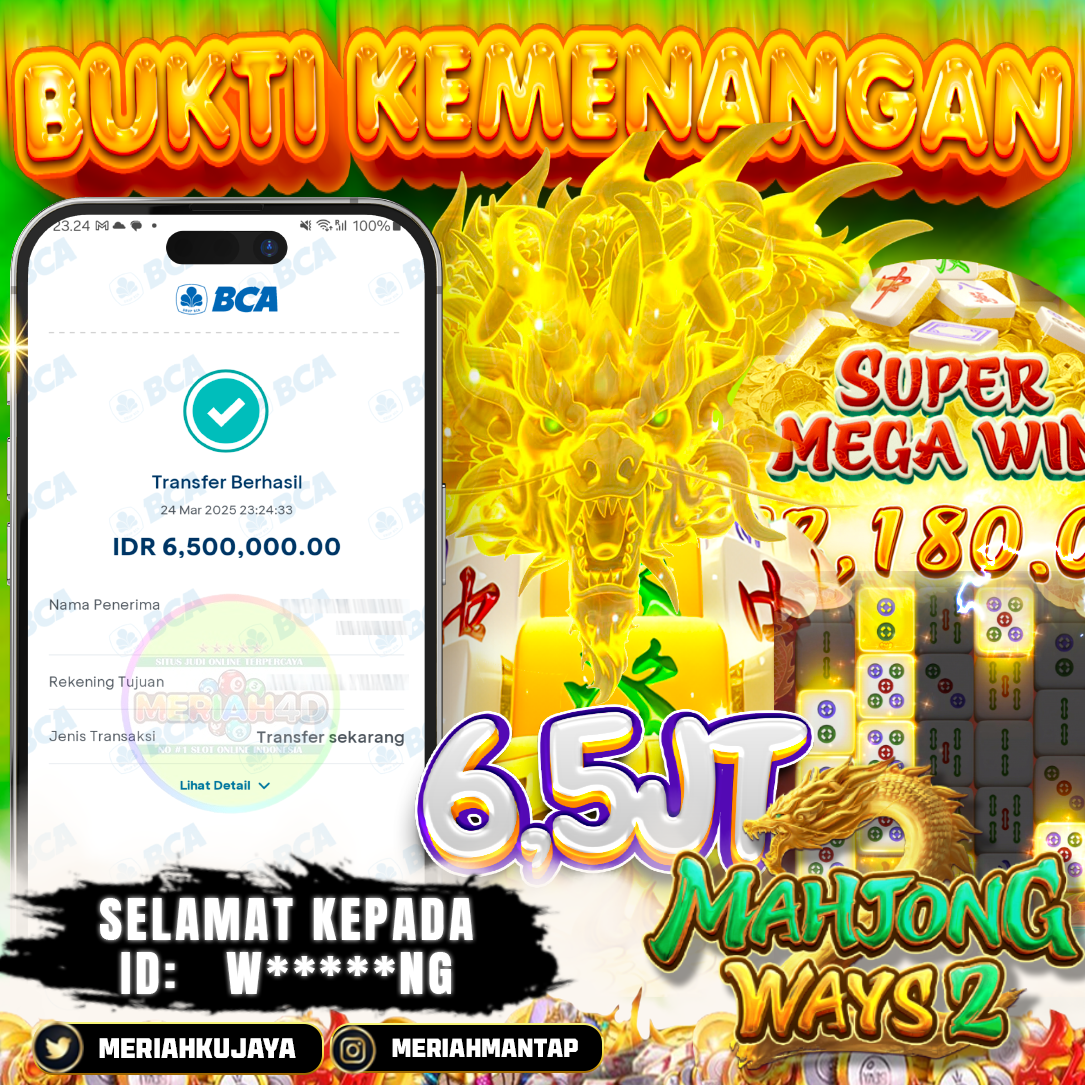 Selamat Kepada ID : W*****NG Atas Withdraw Rp. 6,500,000 Juta Hari ini. Ditunggu Withdraw Selanjutnya dan ajak juga teman temannya bergabung di Meriah4d
