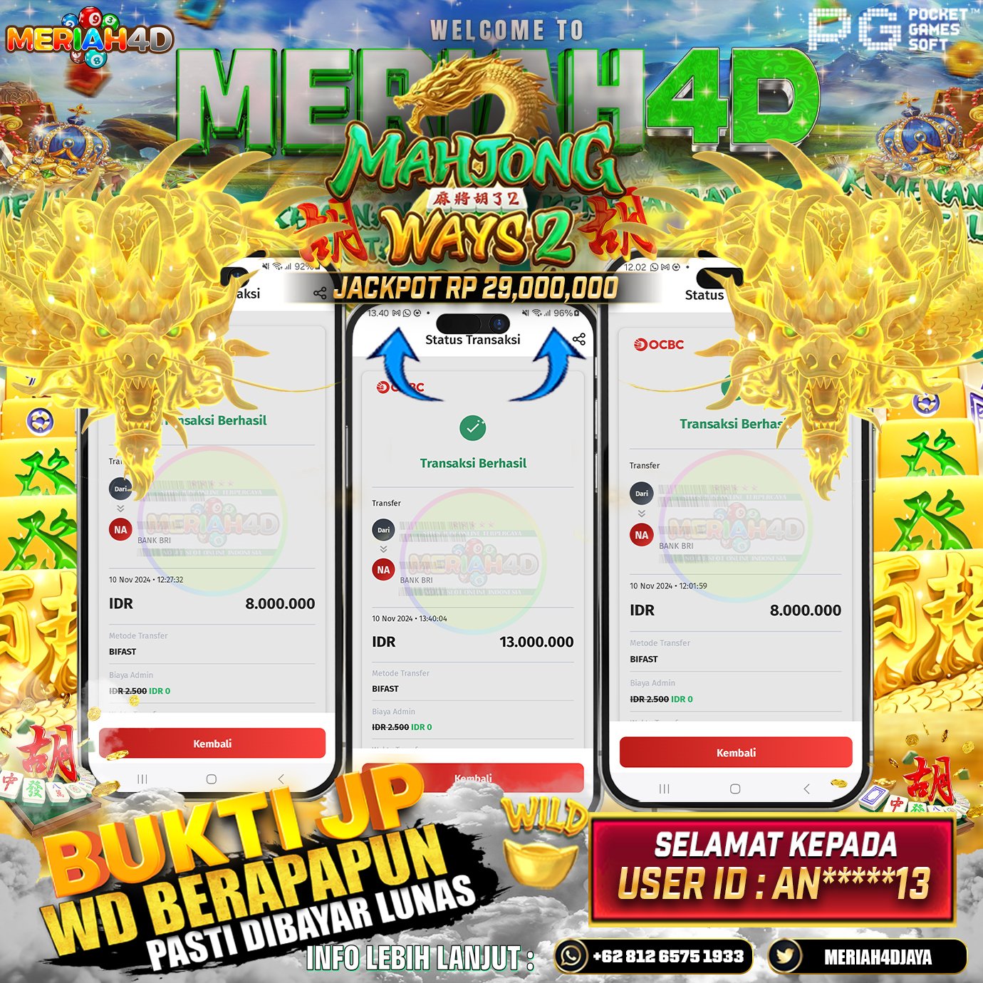Selamat Kepada Id : AN******13 Atas Withdraw Rp. 29.000.000 Juta Hari ini. Ditunggu Withdraw Selanjutnya dan ajak juga teman temannya bergabung di Meriah4d