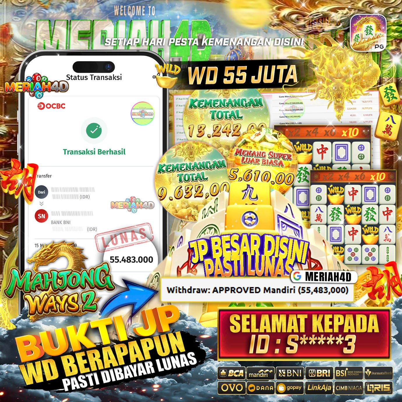 Selamat Kepada Id : S******3 Atas Withdraw Rp. 55.000.000 Juta Hari ini. Ditunggu Withdraw Selanjutnya dan ajak juga teman temannya bergabung di Meriah4d