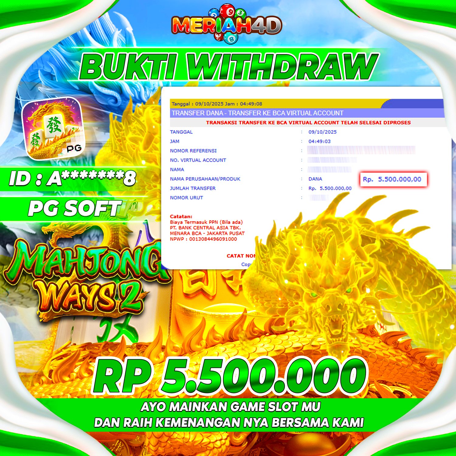 Selamat Kepada ID : A*******8 Atas Withdraw Rp. 5.500.000 Juta Hari ini. Ditunggu Withdraw Selanjutnya dan ajak juga teman temannya bergabung di Meriah4d