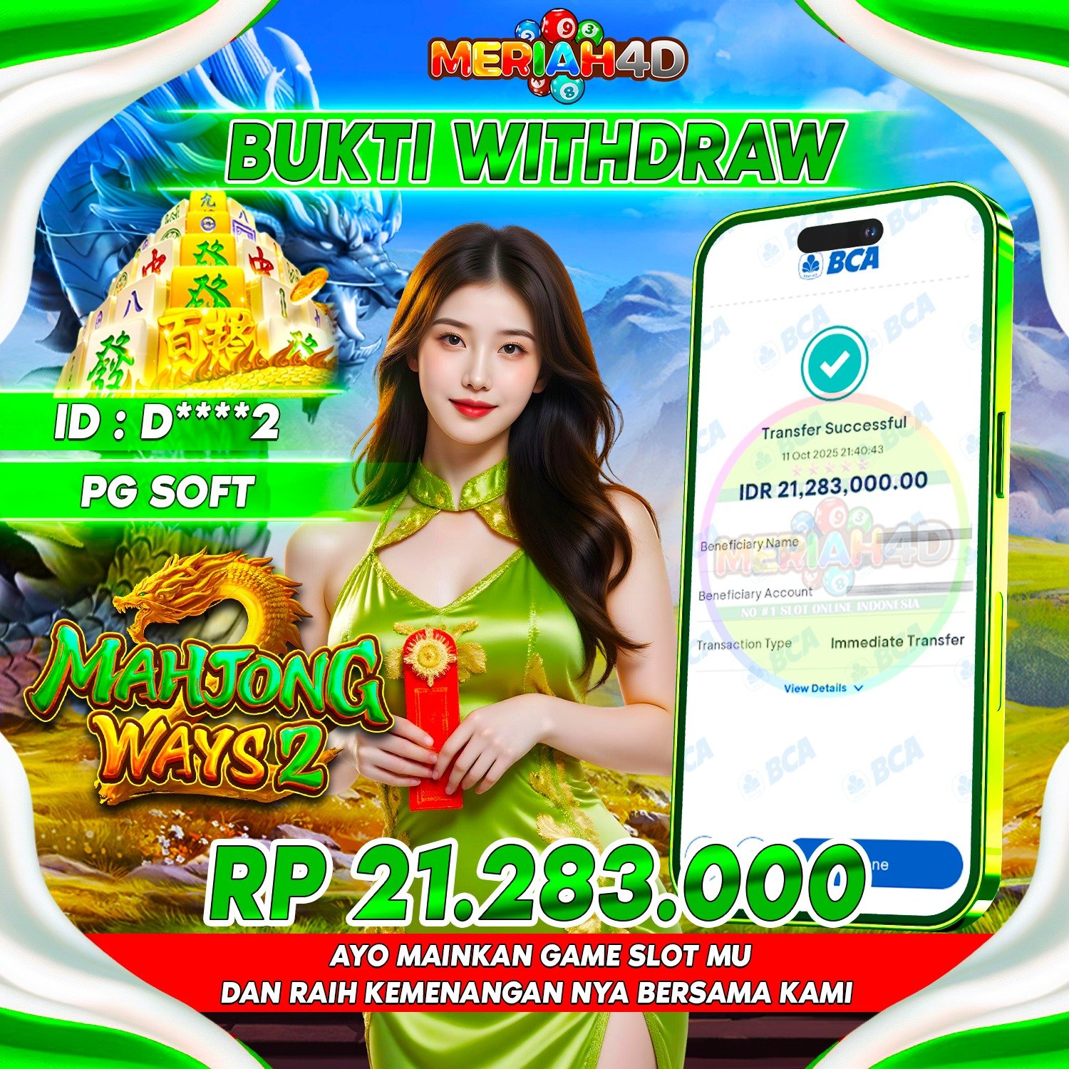 Selamat Kepada ID : D****2 Atas Withdraw Rp. 21.283.000 Juta Hari ini. Ditunggu Withdraw Selanjutnya dan ajak juga teman temannya bergabung di Meriah4d