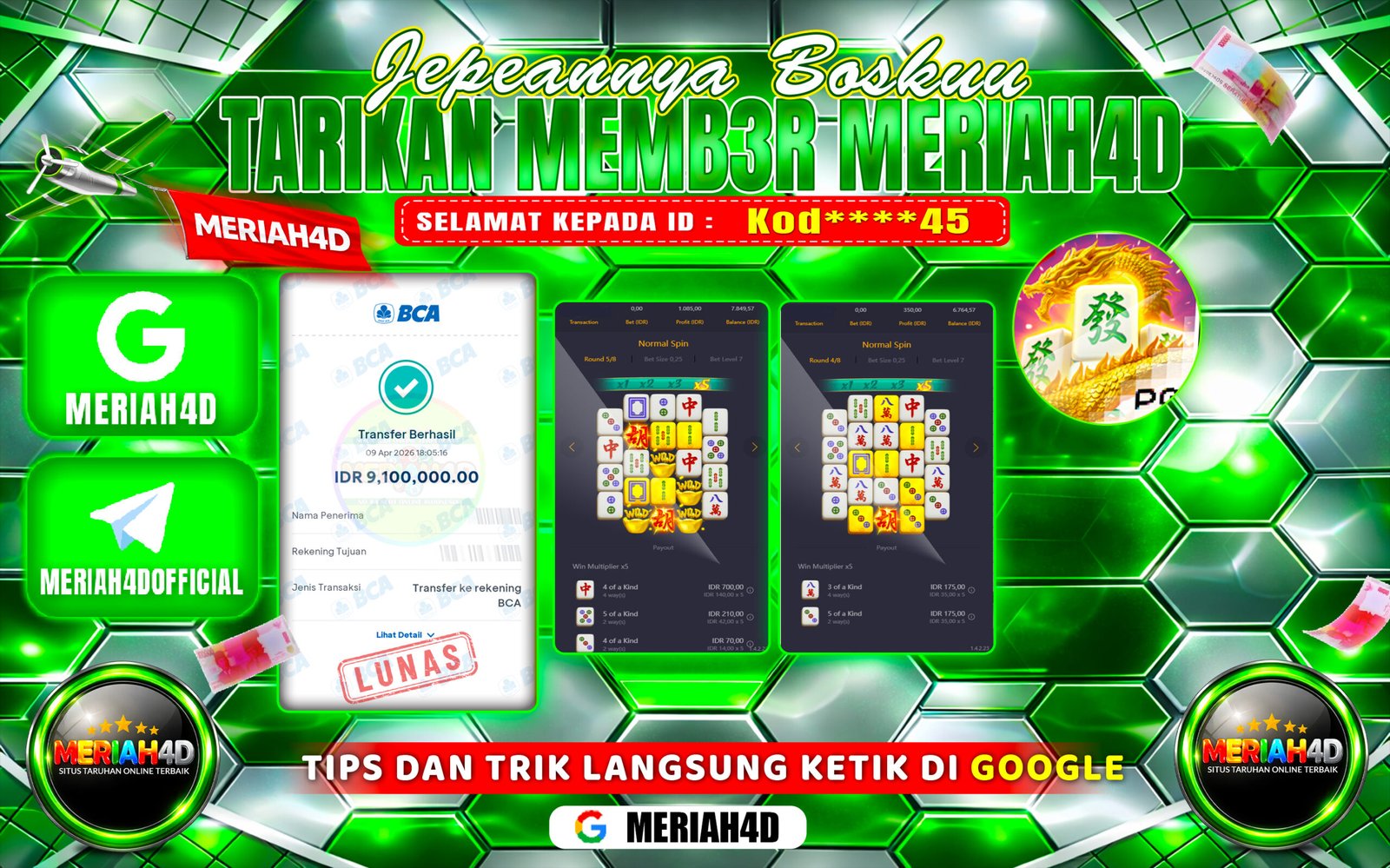 Selamat Kepada ID : Kod****45 Atas Withdraw Rp.9.100.000 Juta Hari ini. Ditunggu Withdraw Selanjutnya dan ajak juga teman temannya bergabung di Meriah4d