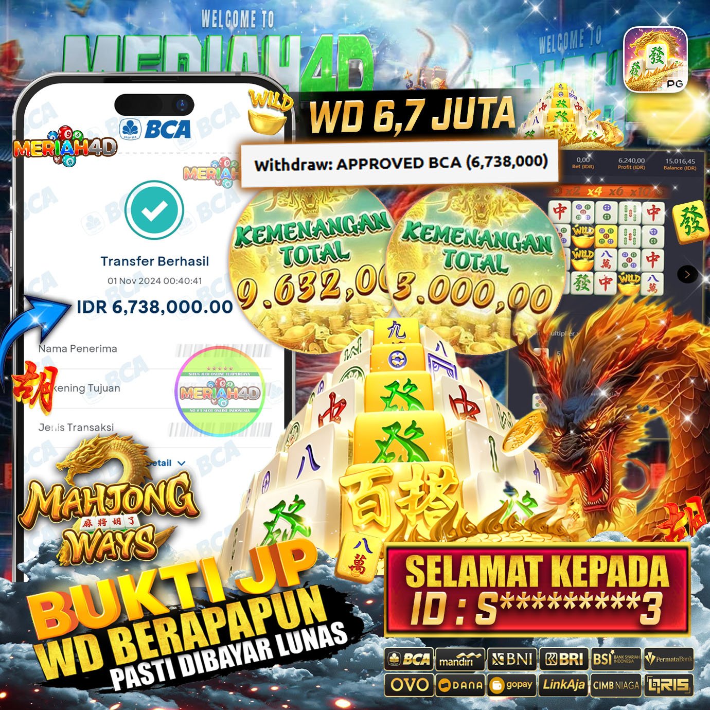 Selamat Kepada Id : S******3 Atas Withdraw Rp. 6.700.000 Juta Hari ini. Ditunggu Withdraw Selanjutnya dan ajak juga teman temannya bergabung di Meriah4d