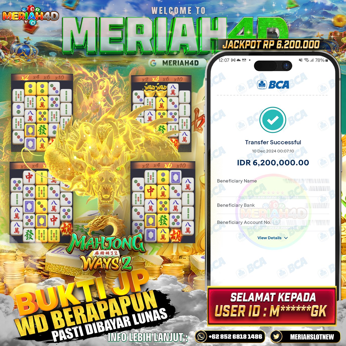 Selamat Kepada ID : M*******GK Atas Withdraw Rp. 6.200.000 Juta Hari ini. Ditunggu Withdraw Selanjutnya dan ajak juga teman temannya bergabung di Meriah4d