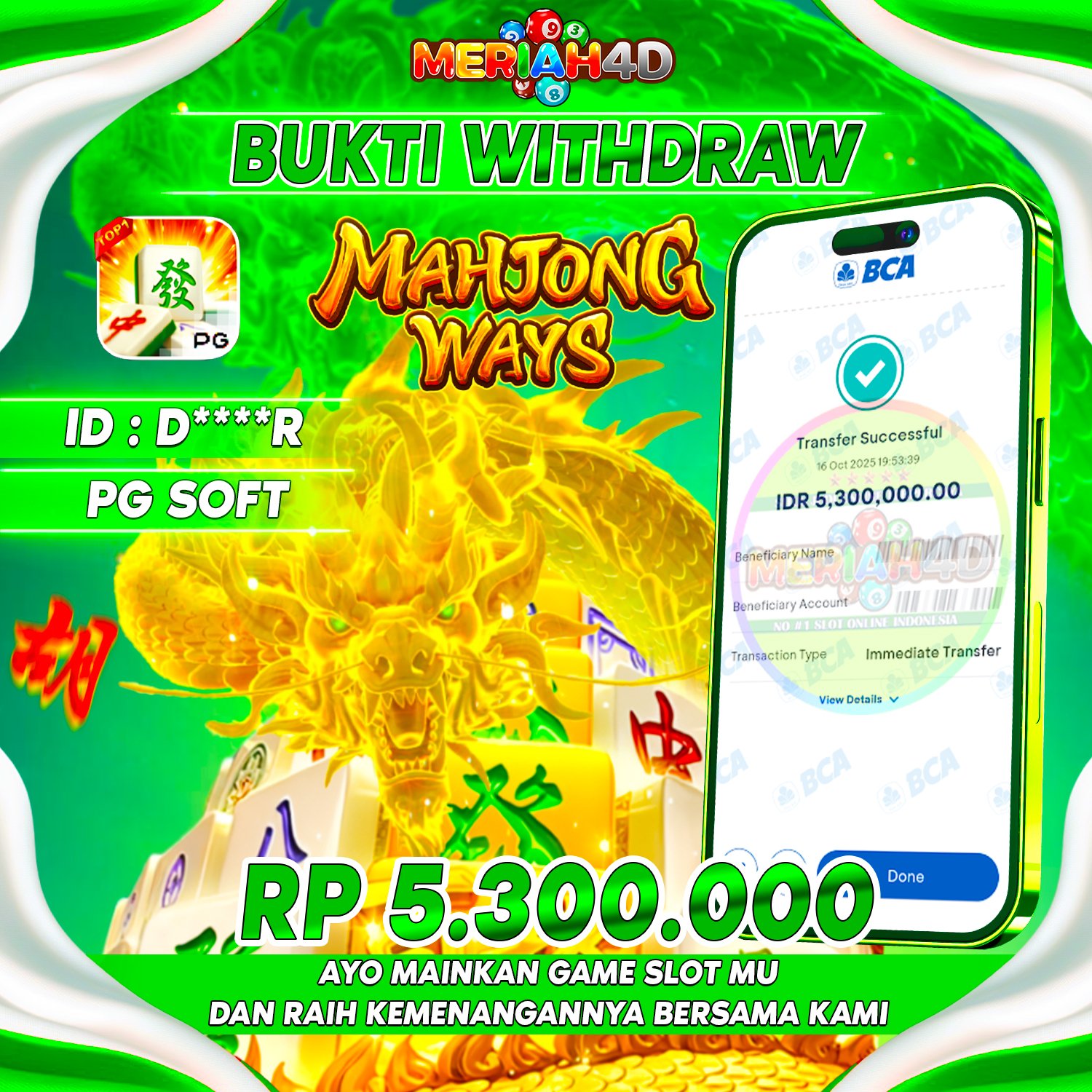 Selamat Kepada ID : D****R Atas Withdraw Rp. 5.300.00 Juta Hari ini. Ditunggu Withdraw Selanjutnya dan ajak juga teman temannya bergabung di Meriah4d