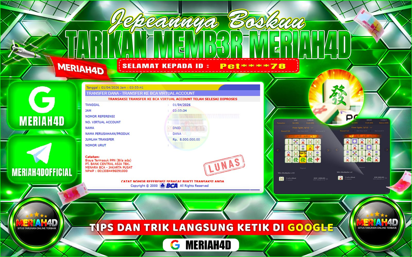 Selamat Kepada ID : PET*****78 Atas Withdraw Rp. 8.000.000 Juta Hari ini. Ditunggu Withdraw Selanjutnya dan ajak juga teman temannya bergabung di Meriah4d