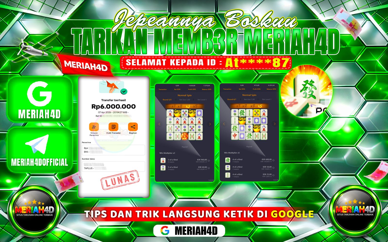 Selamat Kepada ID : AT*****87 Atas Withdraw Rp. 6.000.000 Juta Hari ini. Ditunggu Withdraw Selanjutnya dan ajak juga teman temannya bergabung di Meriah4d