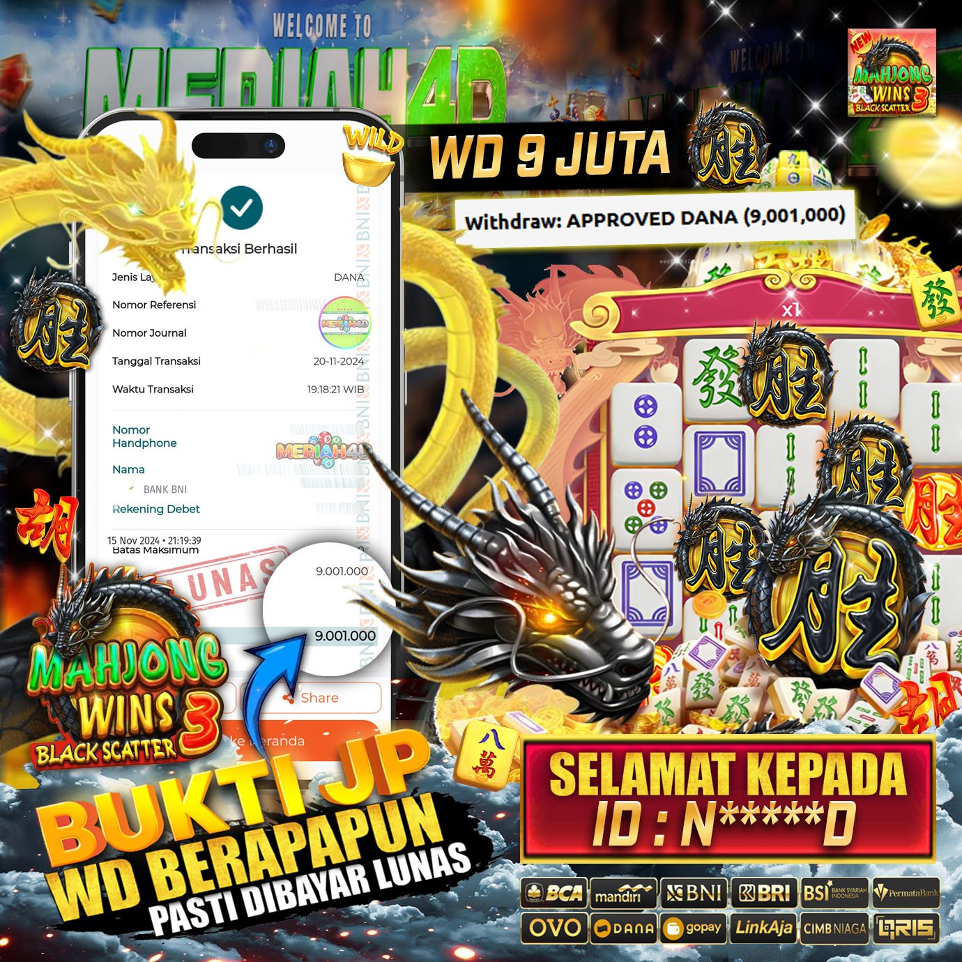 Selamat Kepada Id : N******D Atas Withdraw Rp. 9.001.000 Juta Hari ini. Ditunggu Withdraw Selanjutnya dan ajak juga teman temannya bergabung di Meriah4d