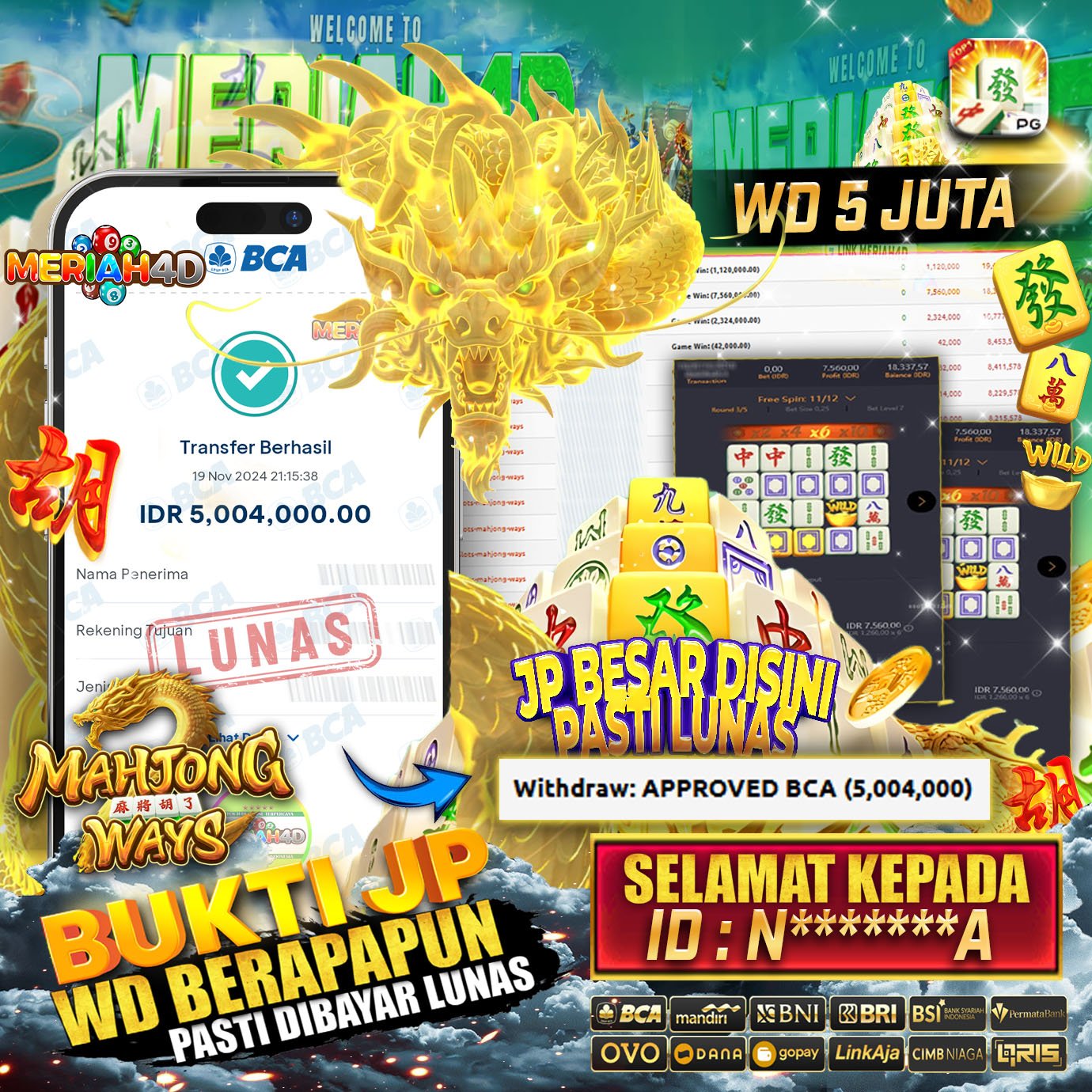 Selamat Kepada Id : N******A Atas Withdraw Rp. 5.004.000 Juta Hari ini. Ditunggu Withdraw Selanjutnya dan ajak juga teman temannya bergabung di Meriah4d