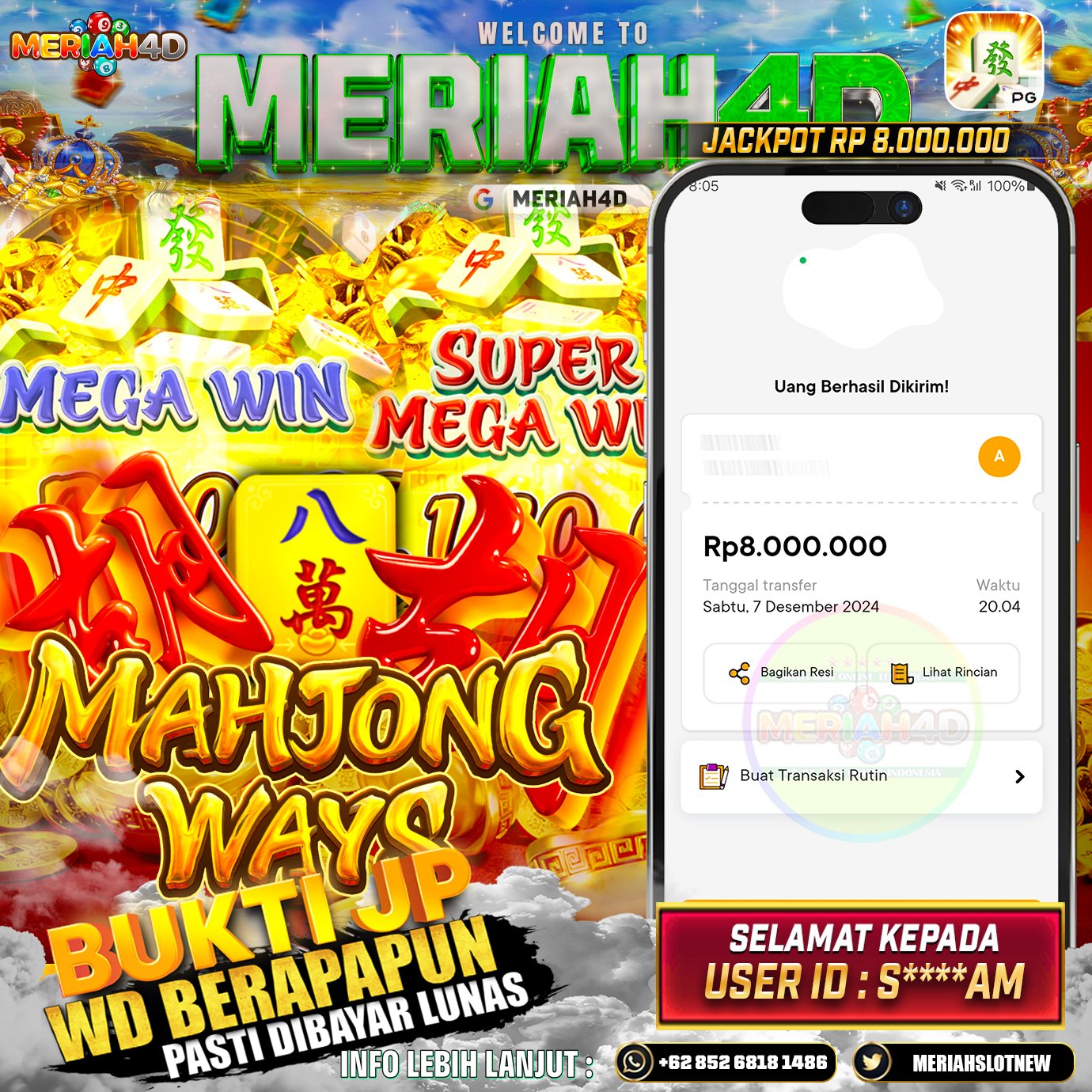 Selamat Kepada Id : S*******AM Atas Withdraw Rp. 8.000.000 Juta Hari ini. Ditunggu Withdraw Selanjutnya dan ajak juga teman temannya bergabung di Meriah4d
