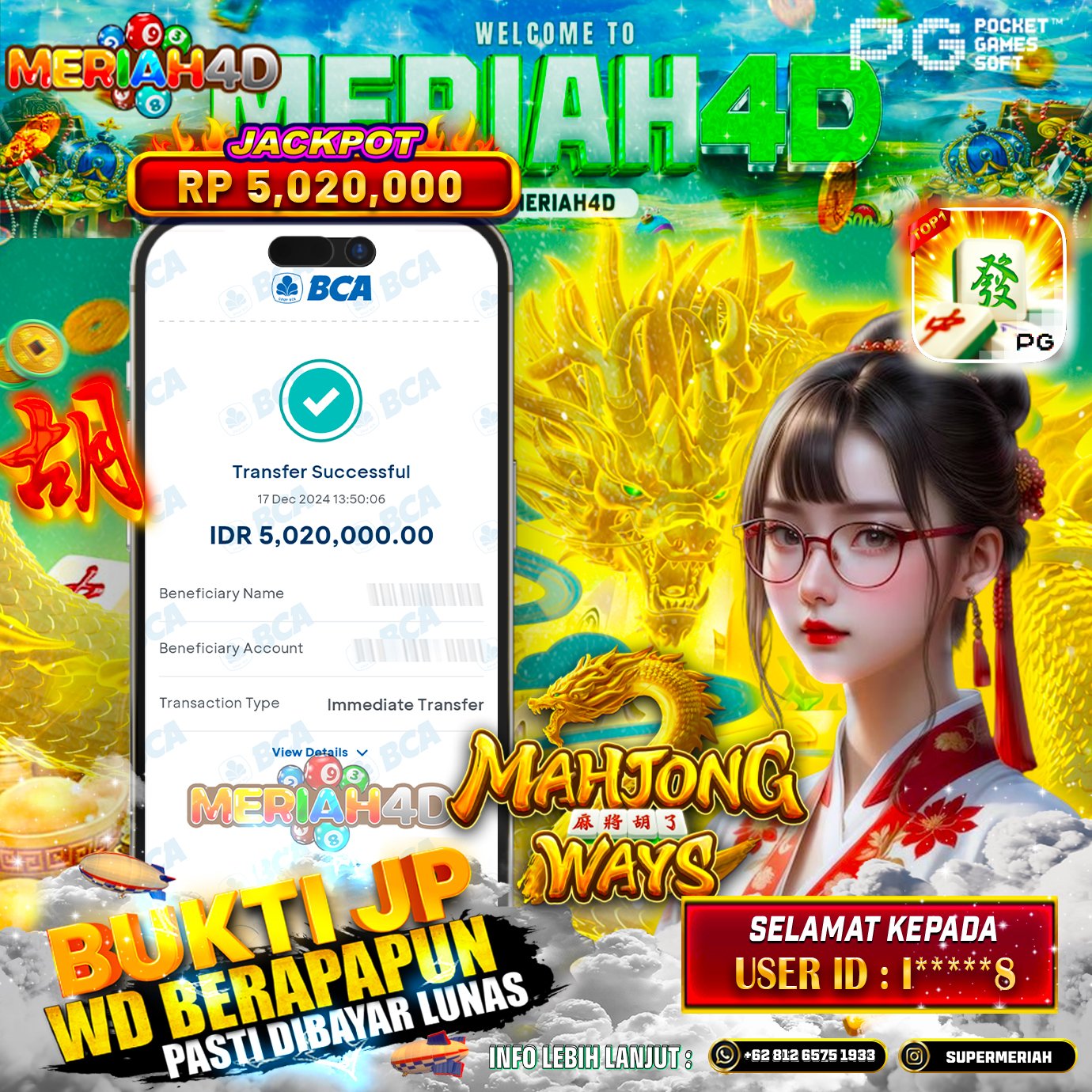 Selamat Kepada ID : I*******8 Atas Withdraw Rp. 5.020.000 Juta Hari ini. Ditunggu Withdraw Selanjutnya dan ajak juga teman temannya bergabung di Meriah4d
