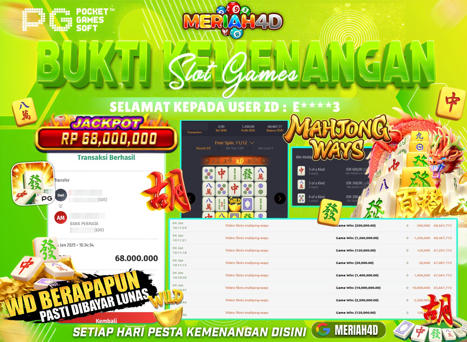 Selamat Kepada ID : E*****3 Atas Withdraw Rp. 68.000.000 Juta Hari ini. Ditunggu Withdraw Selanjutnya dan ajak juga teman temannya bergabung di Meriah4d