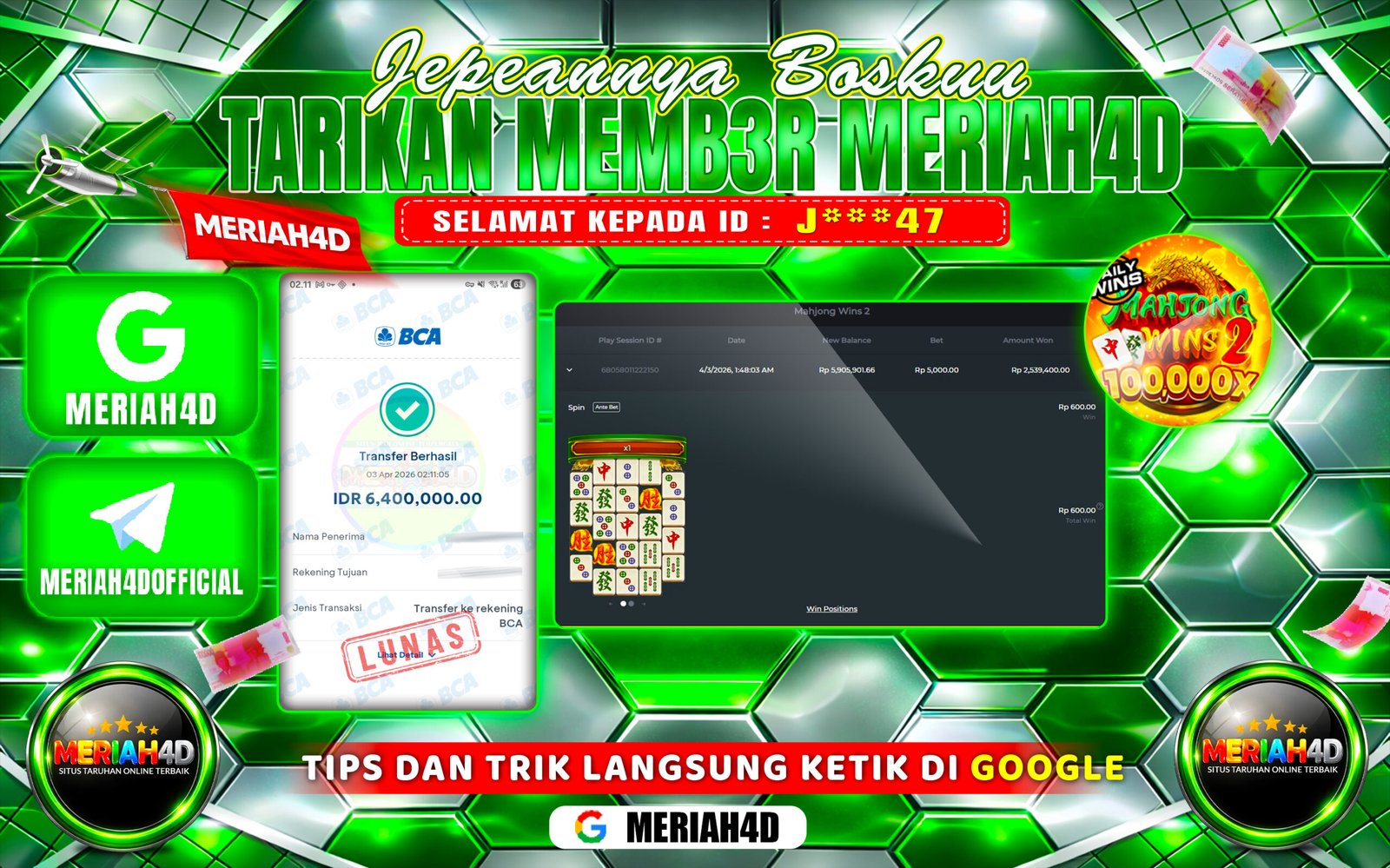 Selamat Kepada ID : J****47 Atas Withdraw Rp. 6.400.000 Juta Hari ini. Ditunggu Withdraw Selanjutnya dan ajak juga teman temannya bergabung di Meriah4d
