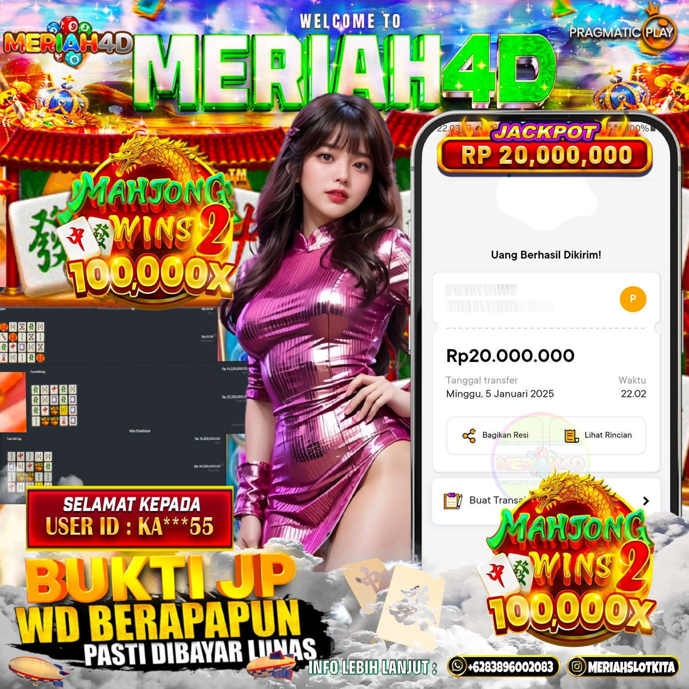 Selamat Kepada ID : KA*****55 Atas Withdraw Rp. 20.000.000 Juta Hari ini. Ditunggu Withdraw Selanjutnya dan ajak juga teman temannya bergabung di Meriah4d
