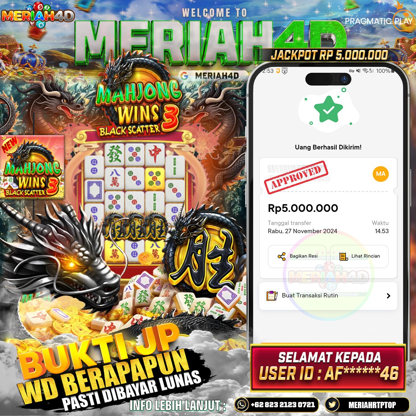 Selamat Kepada Id : AF*****46 Atas Withdraw Rp. 5.000.000 Juta Hari ini. Ditunggu Withdraw Selanjutnya dan ajak juga teman temannya bergabung di Meriah4d