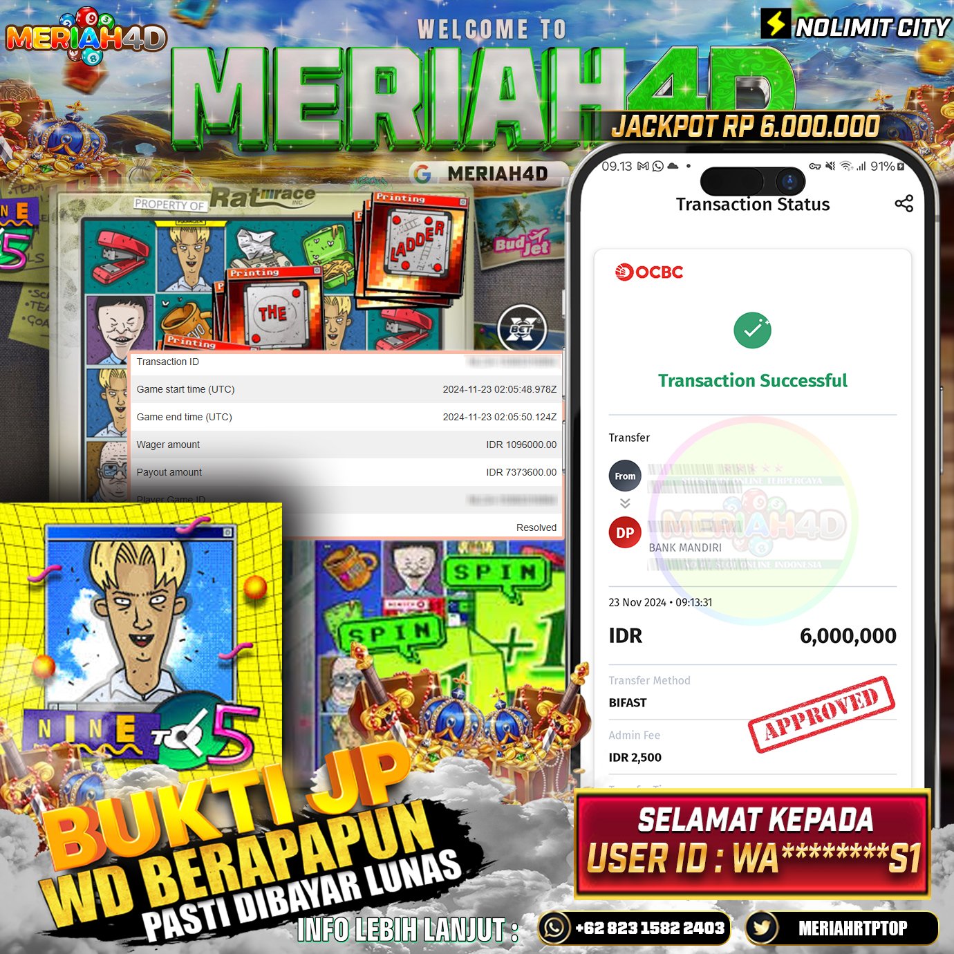 Selamat Kepada Id : WA*******S1 Atas Withdraw Rp. 6.000.000 Juta Hari ini. Ditunggu Withdraw Selanjutnya dan ajak juga teman temannya bergabung di Meriah4d