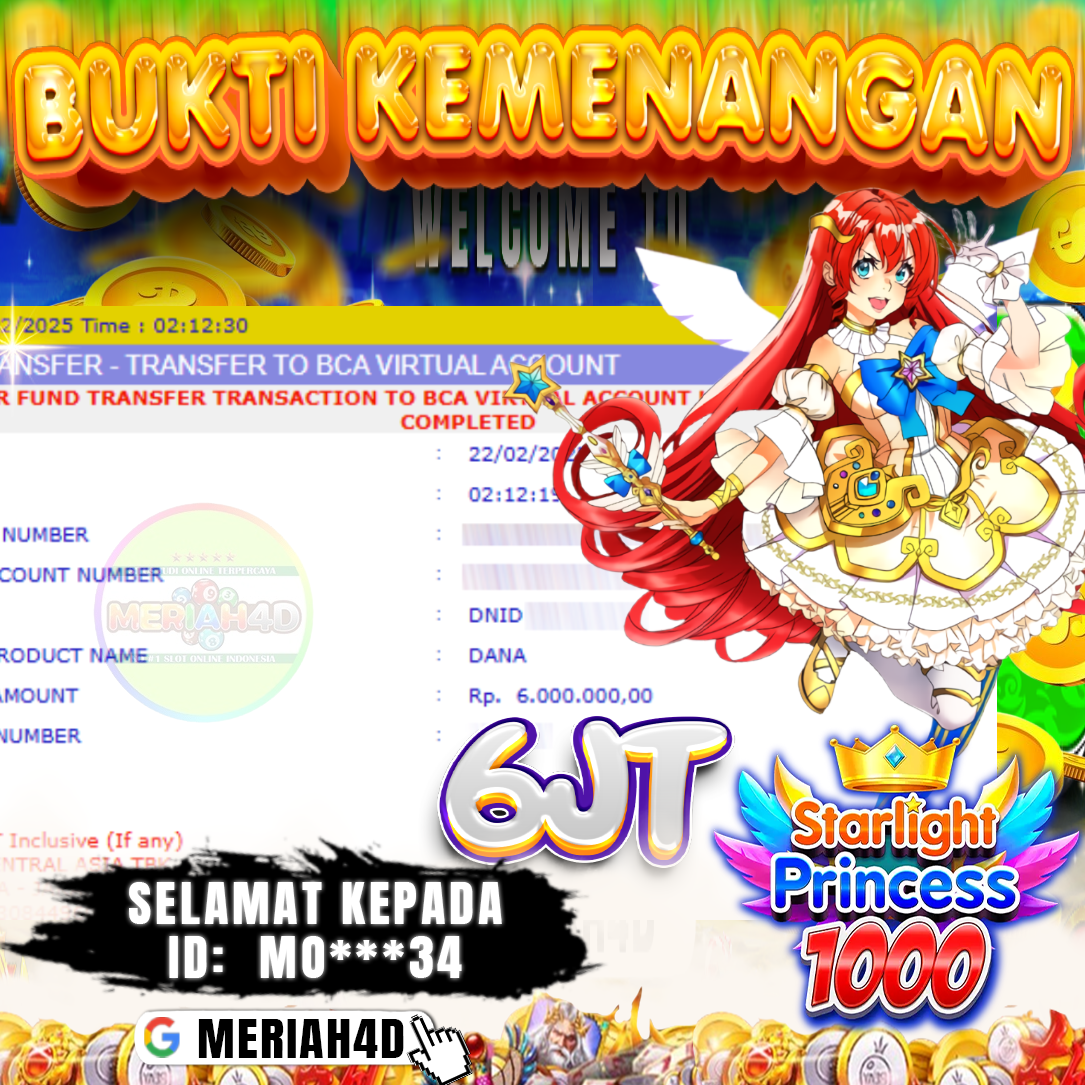 Selamat Kepada ID : MO******34 Atas Withdraw Rp. 6.000.000 Juta Hari ini. Ditunggu Withdraw Selanjutnya dan ajak juga teman temannya bergabung di Meriah4d