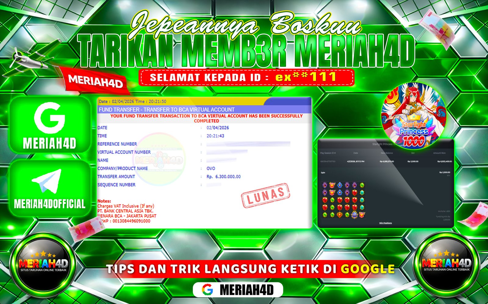 Selamat Kepada ID : EX******111 Atas Withdraw Rp. 6.300.000 Juta Hari ini. Ditunggu Withdraw Selanjutnya dan ajak juga teman temannya bergabung di Meriah4d