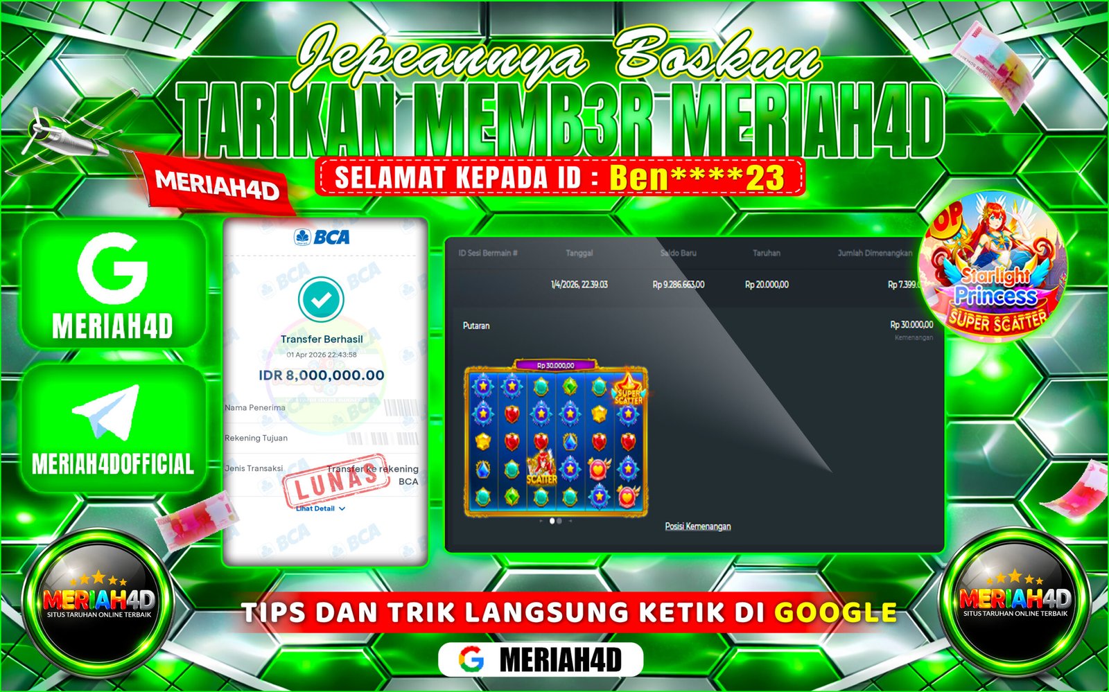Selamat Kepada ID : BEN******23 Atas Withdraw Rp. 8.000.000 Juta Hari ini. Ditunggu Withdraw Selanjutnya dan ajak juga teman temannya bergabung di Meriah4d