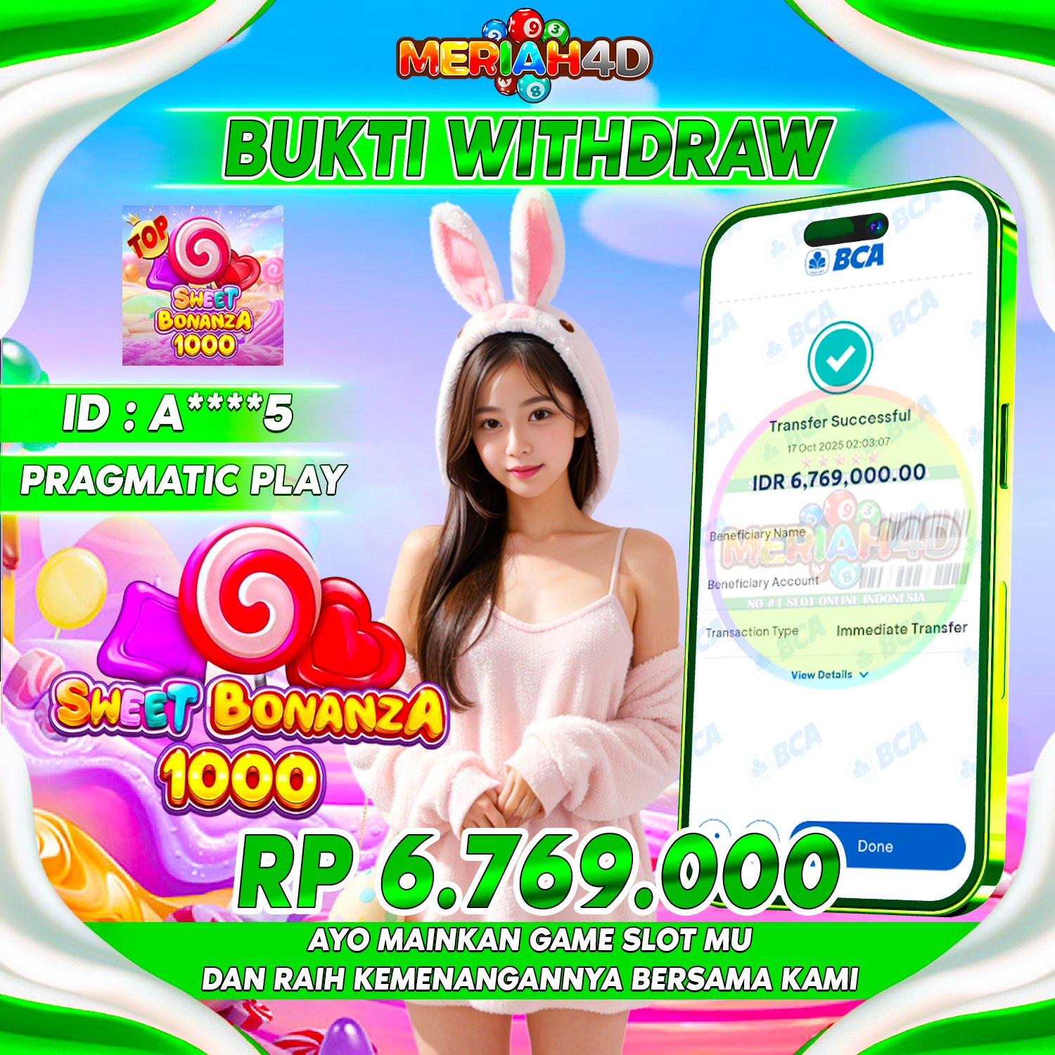 Selamat Kepada ID : A****5 Atas Withdraw Rp. 6.769.000 Juta Hari ini. Ditunggu Withdraw Selanjutnya dan ajak juga teman temannya bergabung di Meriah4d