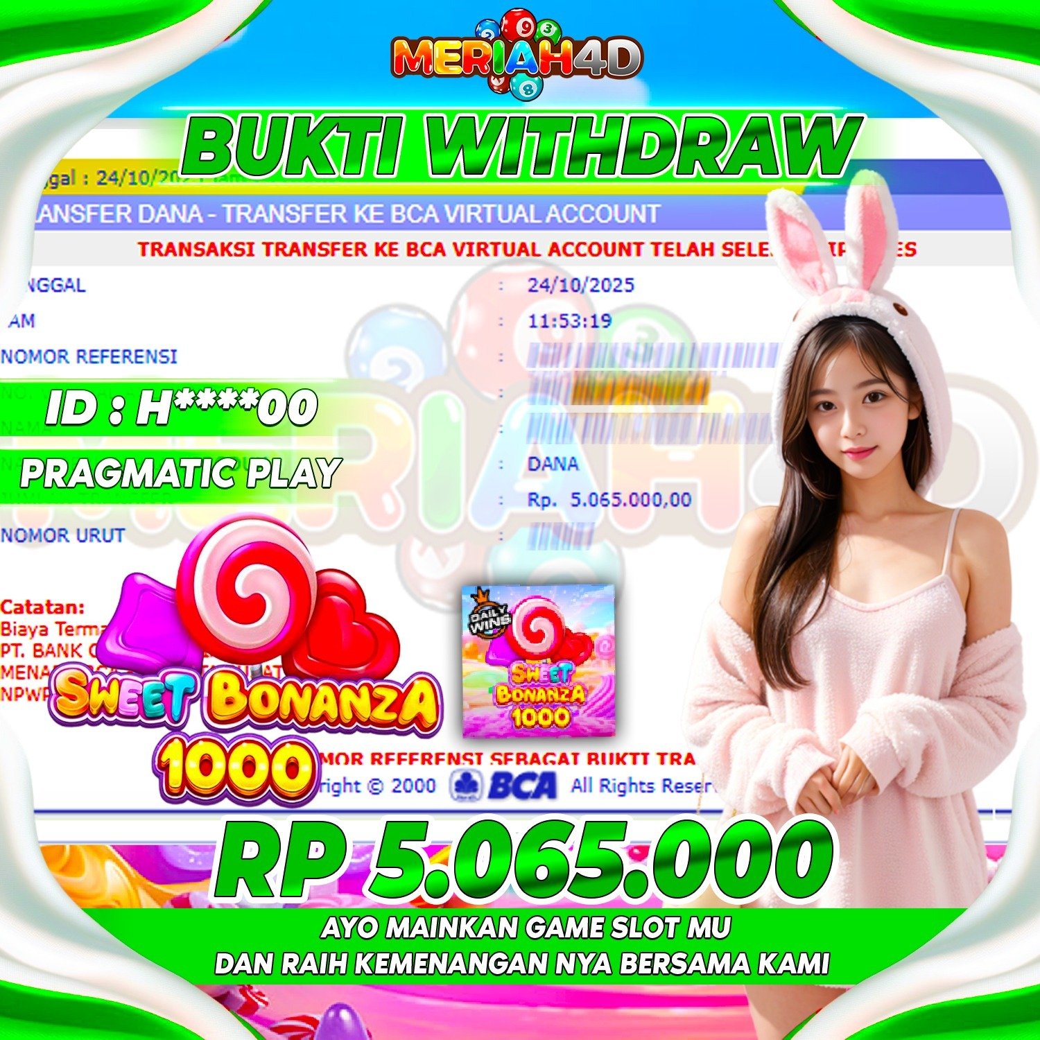 Selamat Kepada ID : H****00 Atas Withdraw Rp. 5.065.000 Juta Hari ini. Ditunggu Withdraw Selanjutnya dan ajak juga teman temannya bergabung di Meriah4d