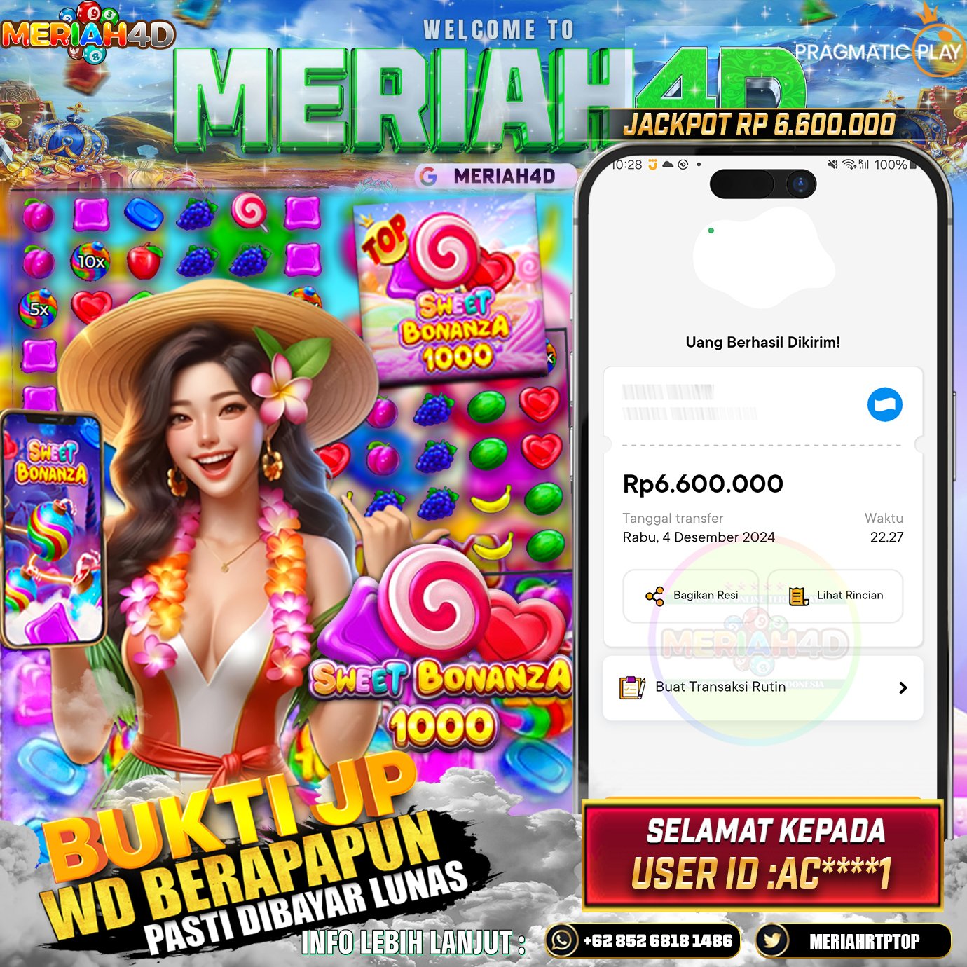 Selamat Kepada Id : AC*******1 Atas Withdraw Rp. 6.600.000 Juta Hari ini. Ditunggu Withdraw Selanjutnya dan ajak juga teman temannya bergabung di Meriah4d