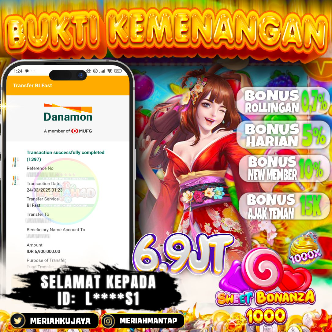 Selamat Kepada ID : L*****S1 Atas Withdraw Rp. 6,900,000 Juta Hari ini. Ditunggu Withdraw Selanjutnya dan ajak juga teman temannya bergabung di Meriah4d