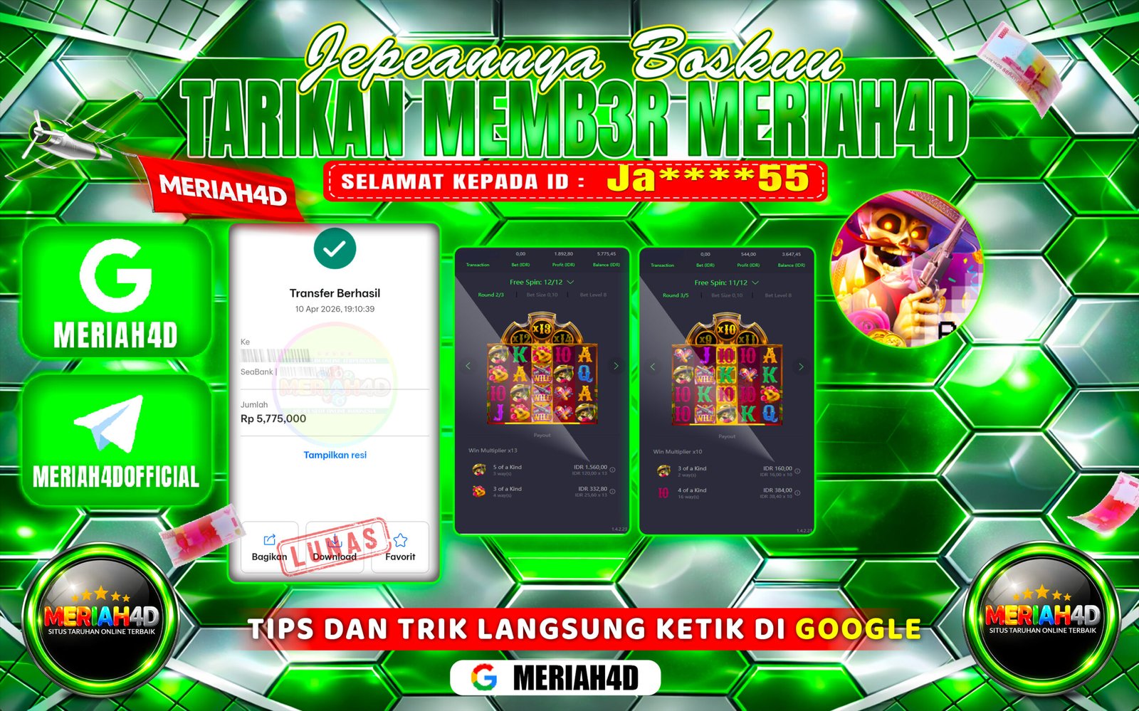 Selamat Kepada ID : Ja*****55 Atas Withdraw Rp. 5.755.000 Juta Hari ini. Ditunggu Withdraw Selanjutnya dan ajak juga teman temannya bergabung di Meriah4d